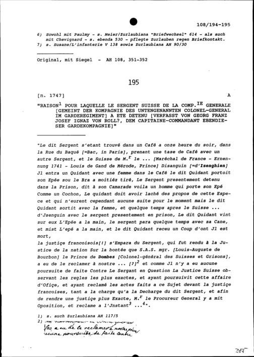 Der Fall von Schweizer Sergeant der Kompanie des Kommandanten im Garderegiment, der in einem Café von Paris einen Kaffee trank, verfasst von Georg Franz Josef Ignaz von Roll, Kommandant der Gardekompanie