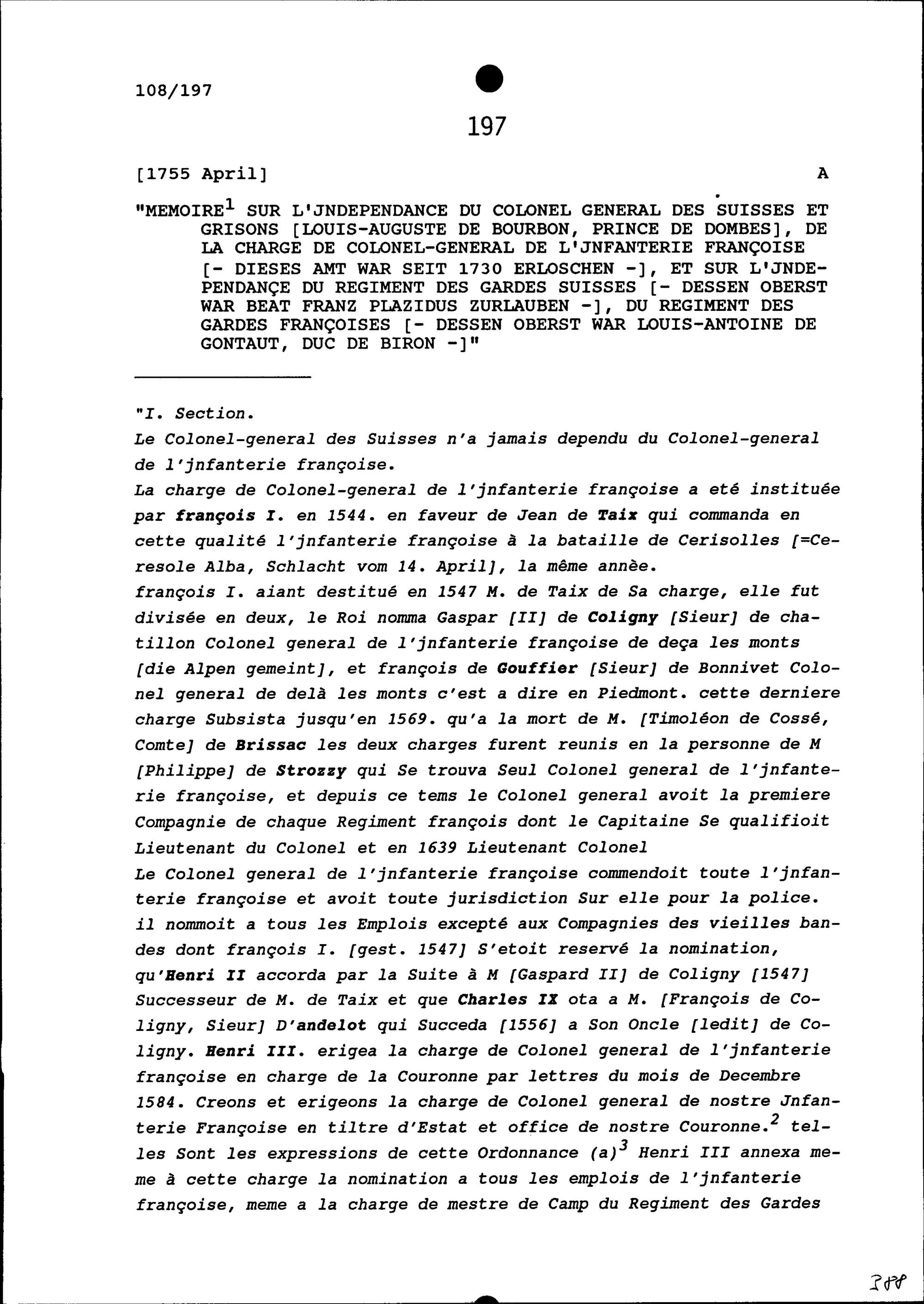 Notiz über die Unabhängigkeit von Louis-Auguste de Bourbon, Prince de Dombes, Kommandant des Regiments der Schweizer und Bündner Garden, betreffend den Posten des Generaloberst in der französischen Infanterie und über die Unabhängigkeit des Schweizer Garderegiments