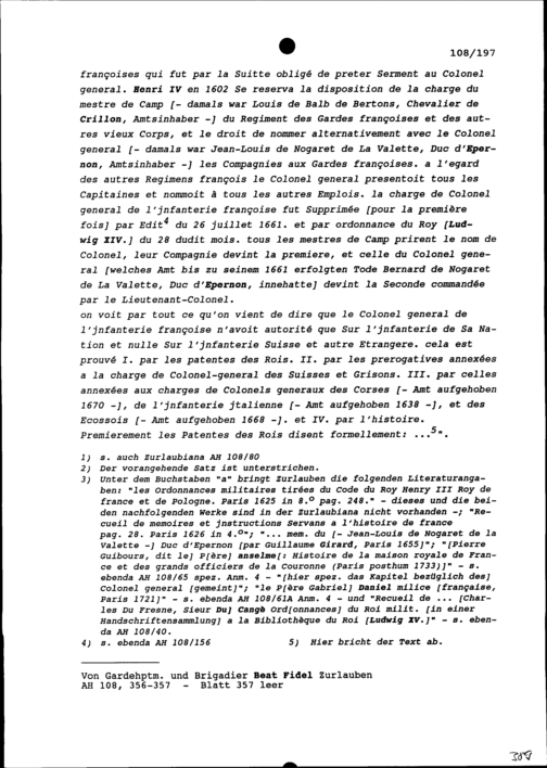 Notiz über die Unabhängigkeit von Louis-Auguste de Bourbon, Prince de Dombes, Kommandant des Regiments der Schweizer und Bündner Garden, betreffend den Posten des Generaloberst in der französischen Infanterie und über die Unabhängigkeit des Schweizer Garderegiments