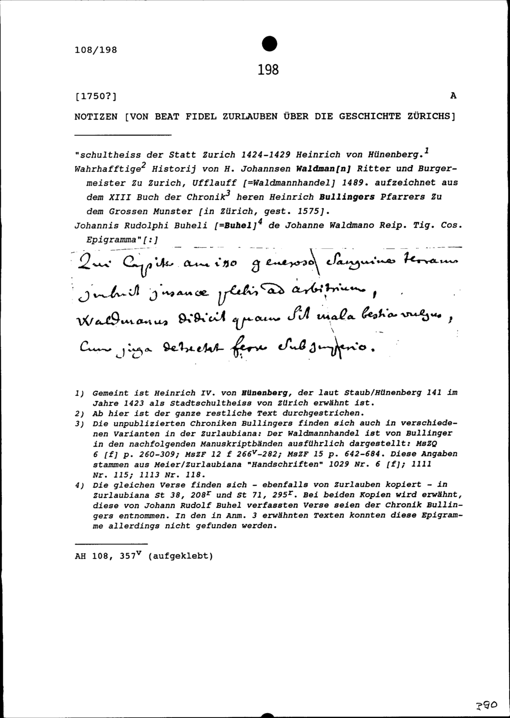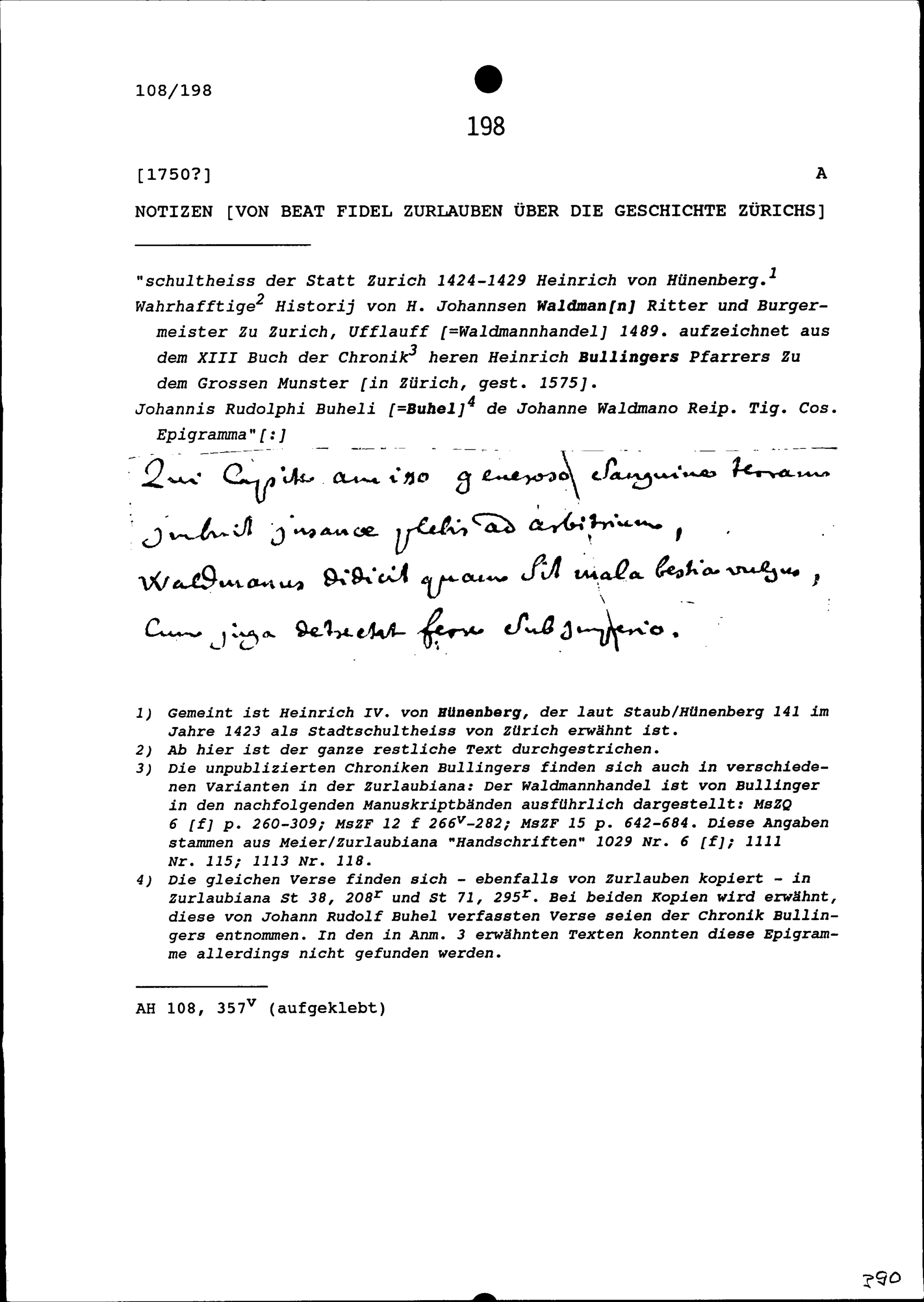 Notiz von Beat Fidel Zurlauben über die Geschichte Zürichs