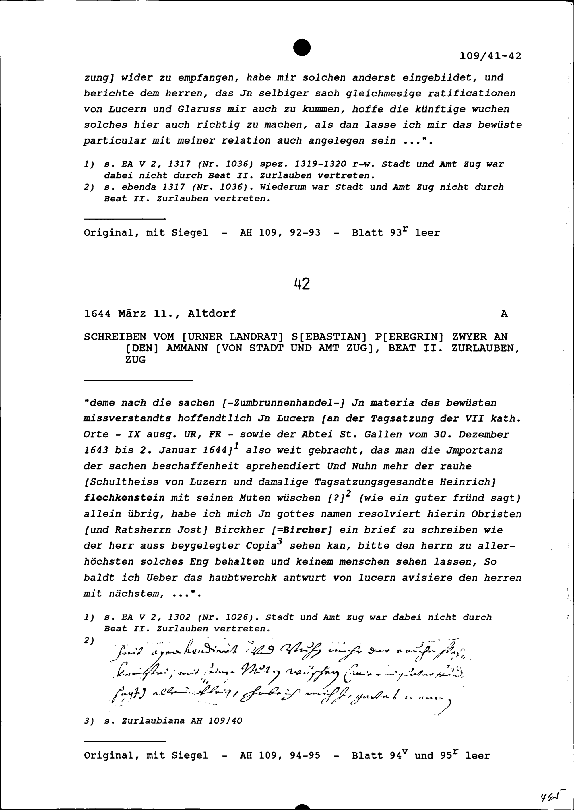 Schreiben von Sebastian Peregrin Zwyer, Landrat Uri, an Beat II. Zurlauben, Ammann von Stadt und Amt Zug, Zug