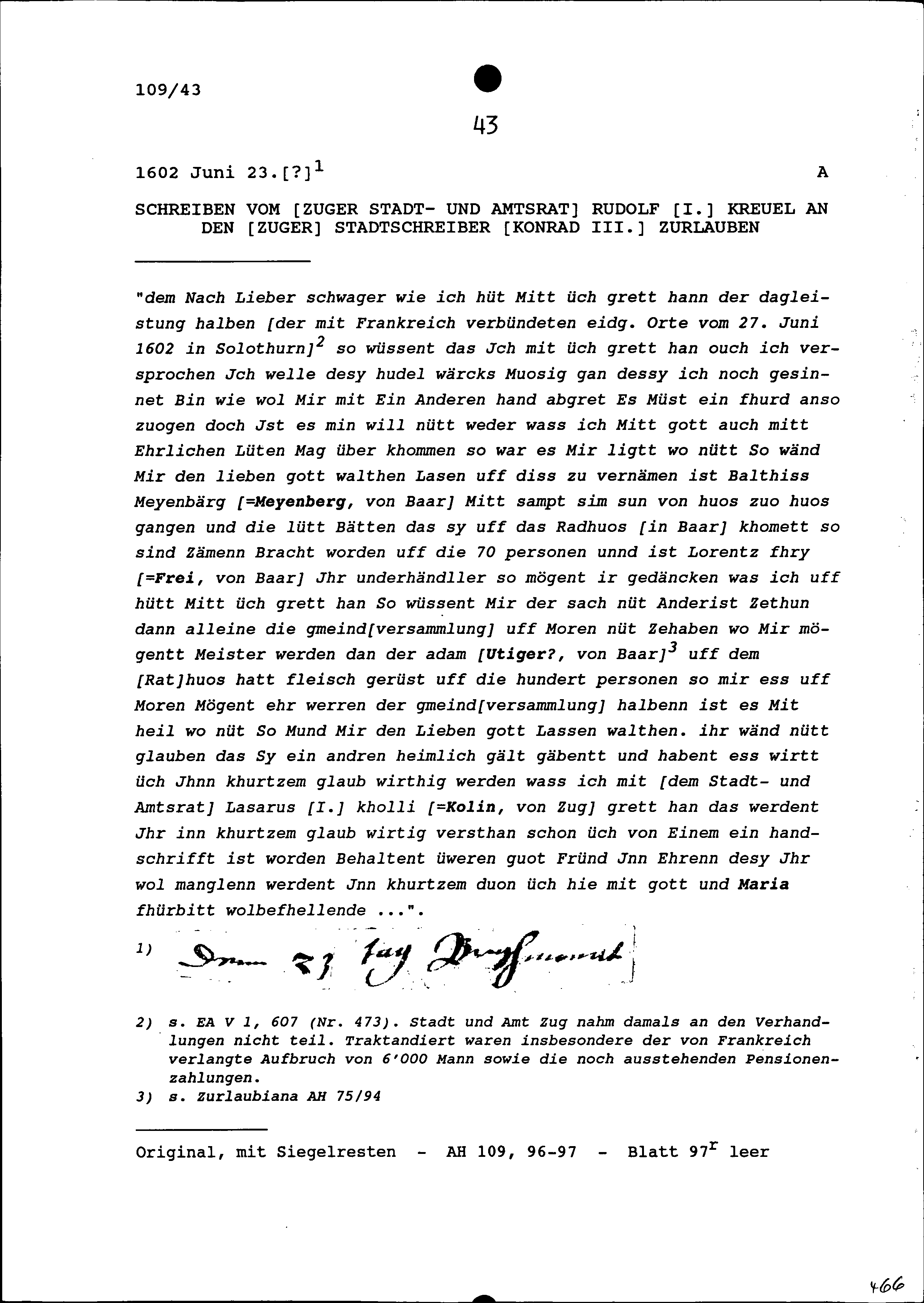 Schreiben von Rudolf I. Kreuel, Stadt- und Amtrat Zug, an Konrad III. Zurlauben, Zuger Stadtschreiber