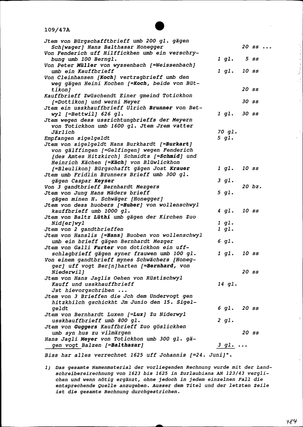 Rechnung für Siegelgeld der Kanzleigefälle unter Sebastian Heinrich Kuon (Kuhn), Landvogt der Freien Ämter und Landrat zu Uri, 1623 bis Johannis 1624, aufgezeichnet von Beat II. Zurlauben, Landschreiber