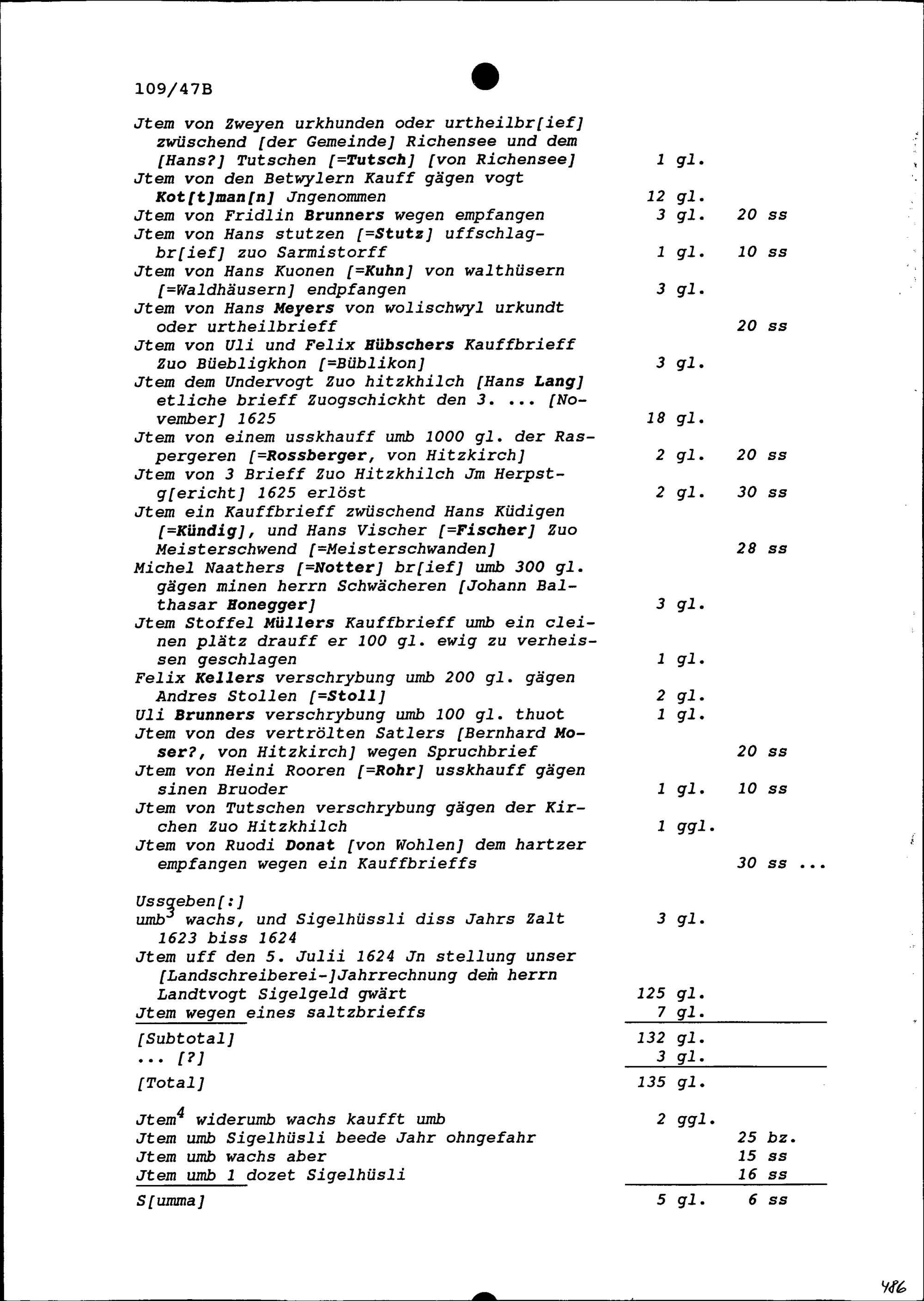 Rechnung für Siegelgeld der Kanzleigefälle unter Sebastian Heinrich Kuon (Kuhn), Landvogt der Freien Ämter und Landrat zu Uri, aufgezeichnet von Beat II. Zurlauben, Landschreiber