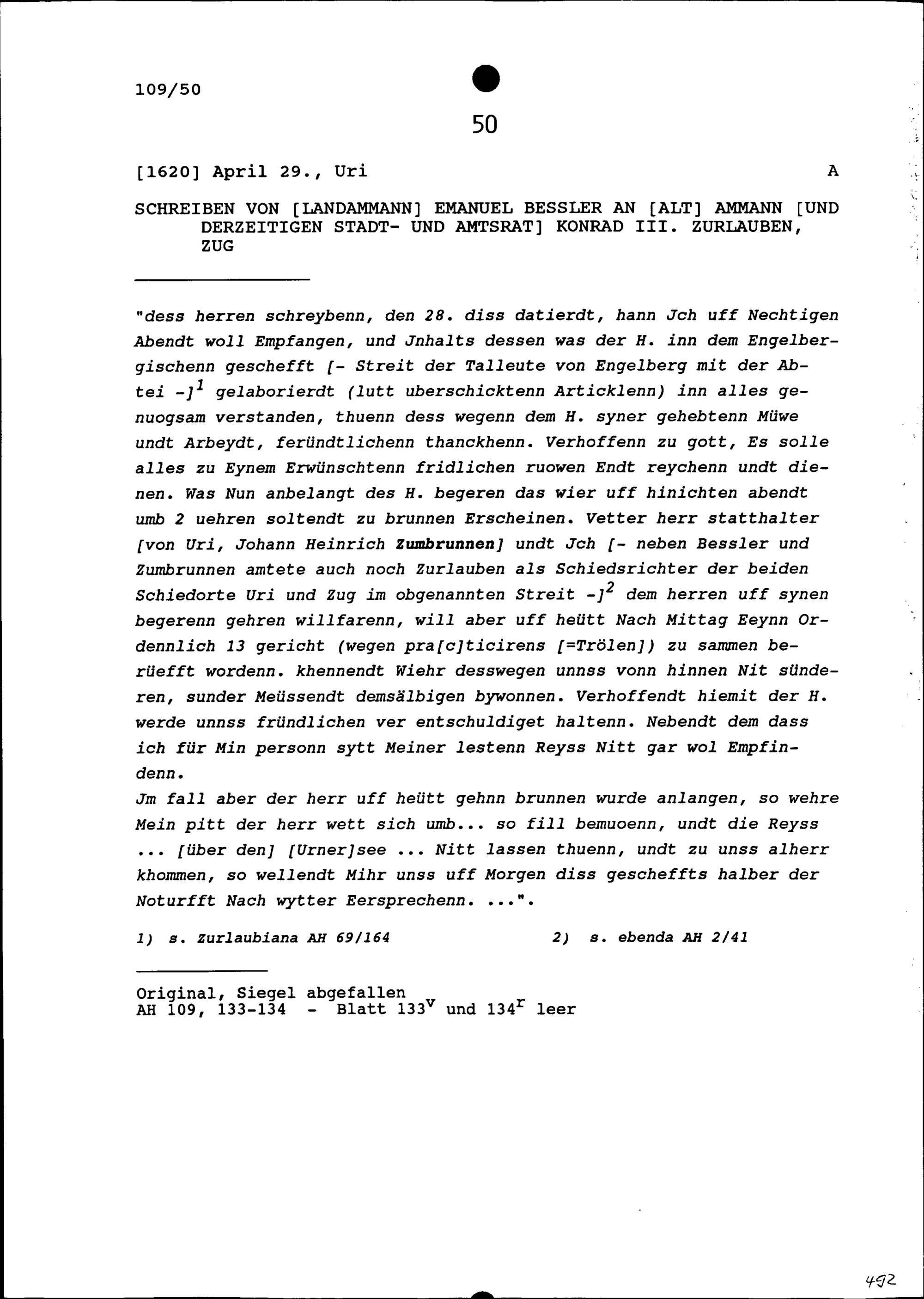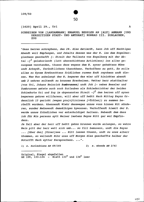 Schreiben von Emanuel Bessler, Landammann, an Konrad III. Zurlauben, Altammann und Stadt- und Amtrat, Zug