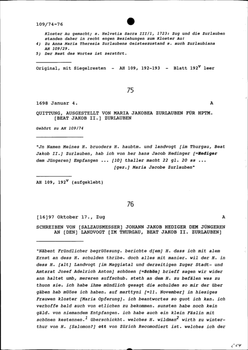 Quittung für Beat Jakob II. Zurlauben, Hauptmann, ausgestellt von Maria Jakobea ...