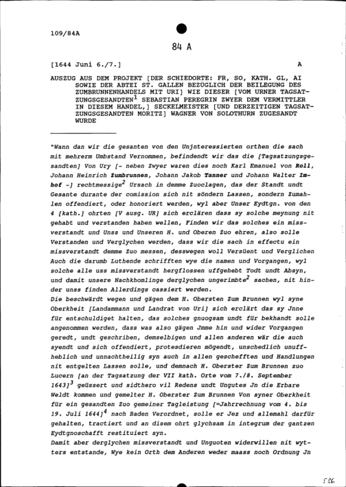 Vorschlag der unbeteiligten Schiedsorte Freiburg, Solothurn, Katholisch Glarus und Appenzell-Innerrhoden sowie der Abtei Sankt Gallen zur Beilegung des Zumbrunnenhandels mit Uri wie dieser von Sebastian Peregrin Zwyer, Urner Tagsatzungsgesandter, an Moritz Wagner, Vermittler, Seckelmeister und Tagsatzungsgesandter von Solothurn gesandt wurde
