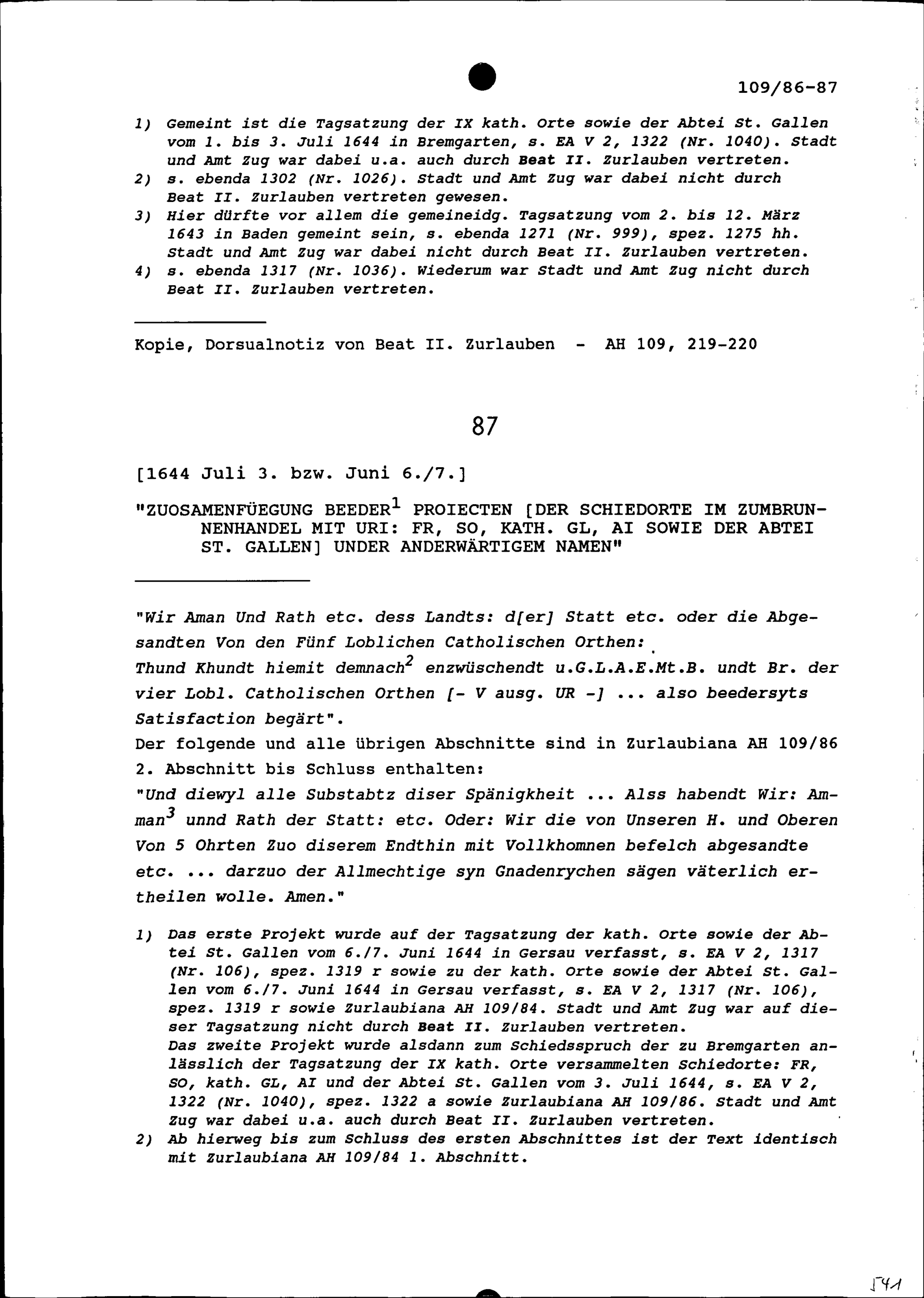 Vereinter Vorschlag der Schiedsorte Freiburg, Solothurn, Katholisch Glarus und Appenzell-Innerrhoden sowie der Abtei Sankt Gallen unter andern im Zumbrunnenhandel mit Uri