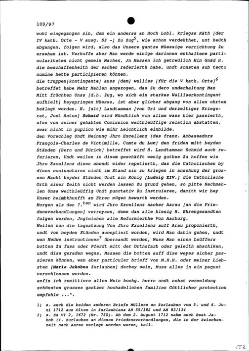 Schreiben von Wolfgang Damian Müller, Tagsatzungsgesandter von Stadt und Amt Zug an den Friedensverhandlungen im Villmergerkrieg, an Beat Jakob II. Zurlauben, Landeshauptmann von Stadt und Amt Zug