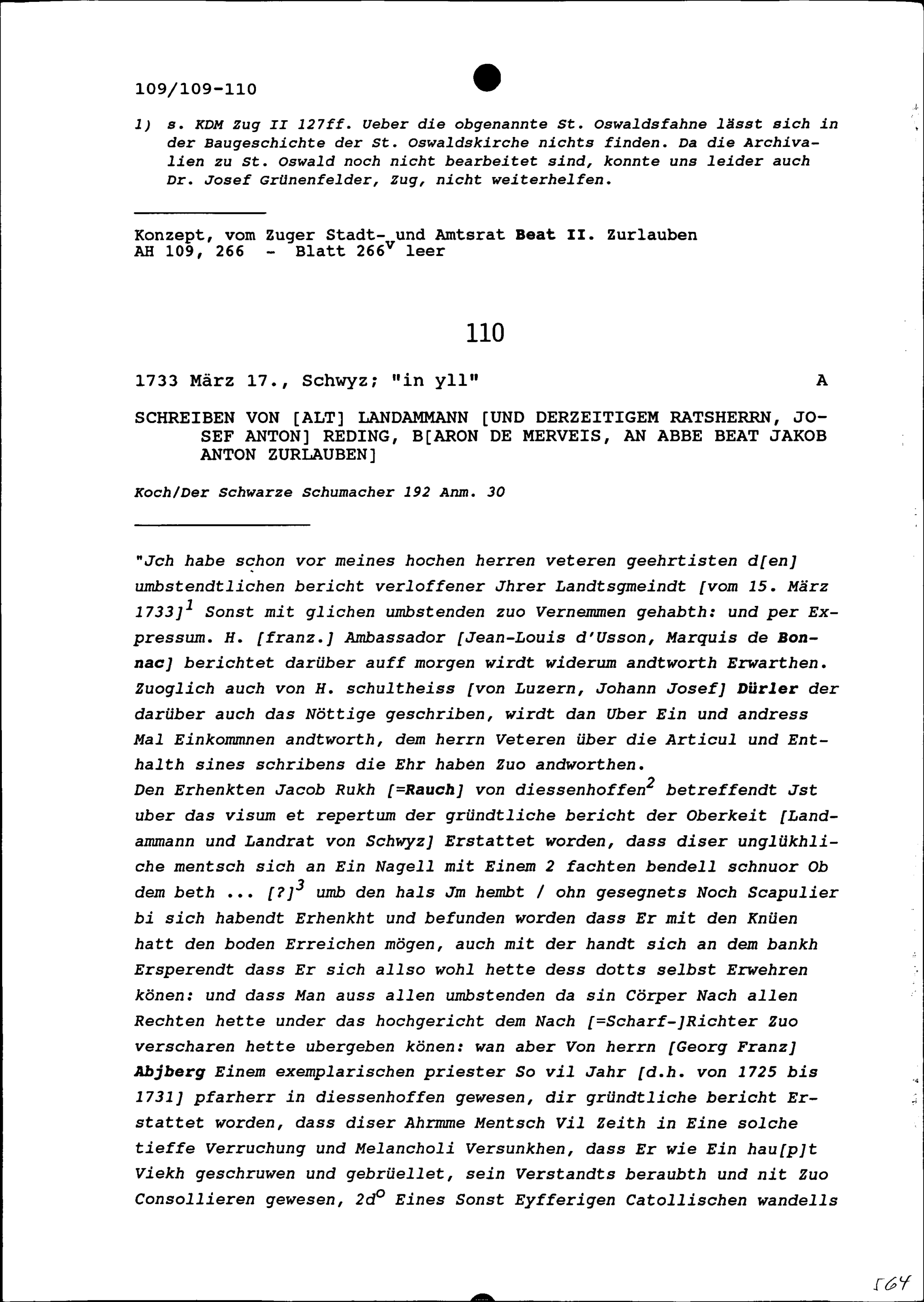 Schreiben von Josef Anton Reding, Altlandammann und Ratsherrn, an Beat Jakob Anton Zurlauben, Priester