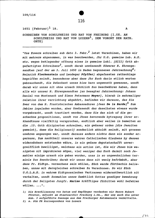 Schreiben des Schultheiss und Rats von Freiburg im Üchtland an Schultheiss und Rat Luzern, Vorort der Katholischen Orte