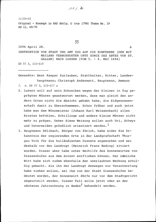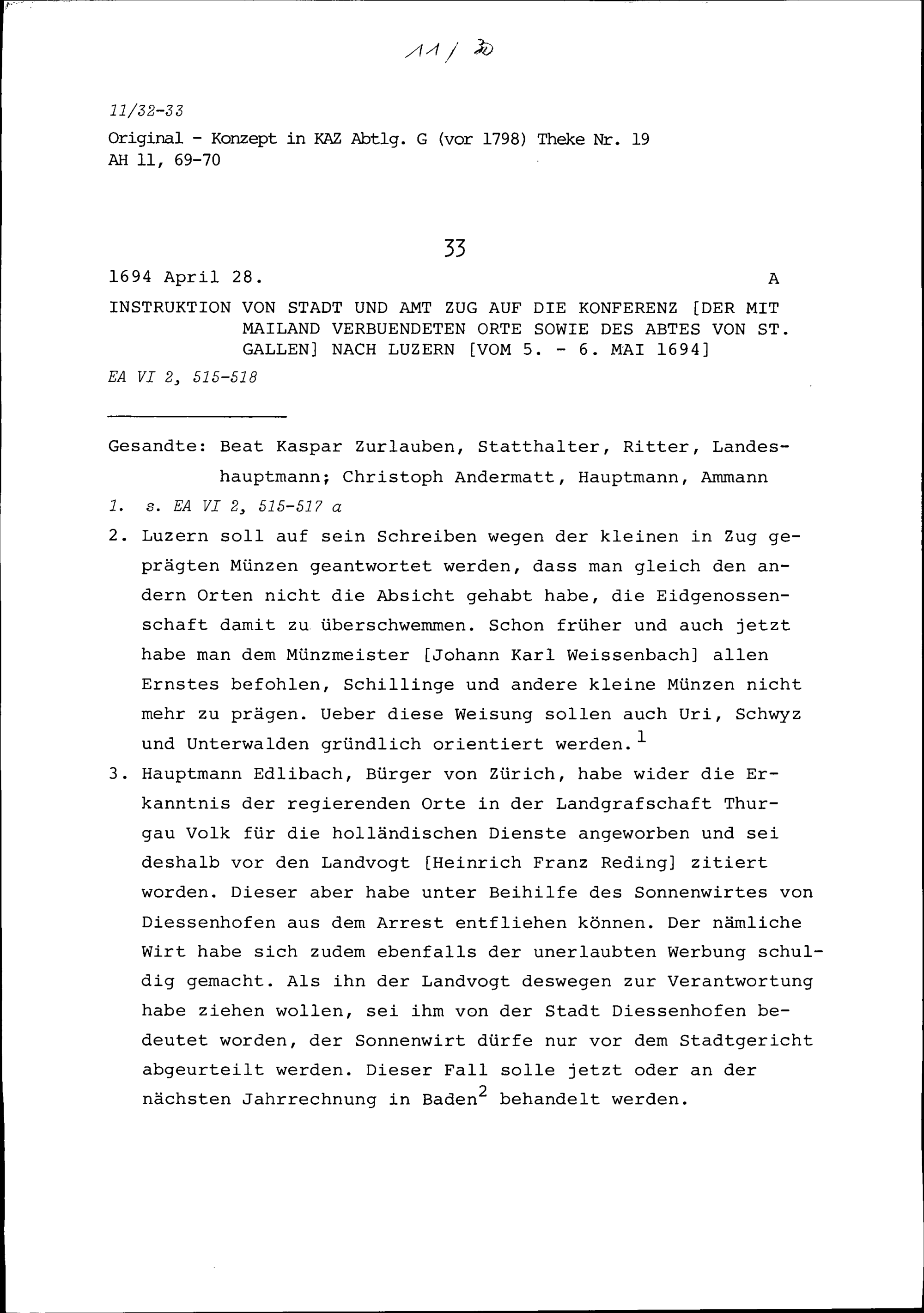 Instruktion von Stadt und Amt Zug auf die Konferenz der mit Mailand verbündeten Orte sowie des Abtes von Sankt Gallen in Luzern vom 5. bis 6. Mai 1694
