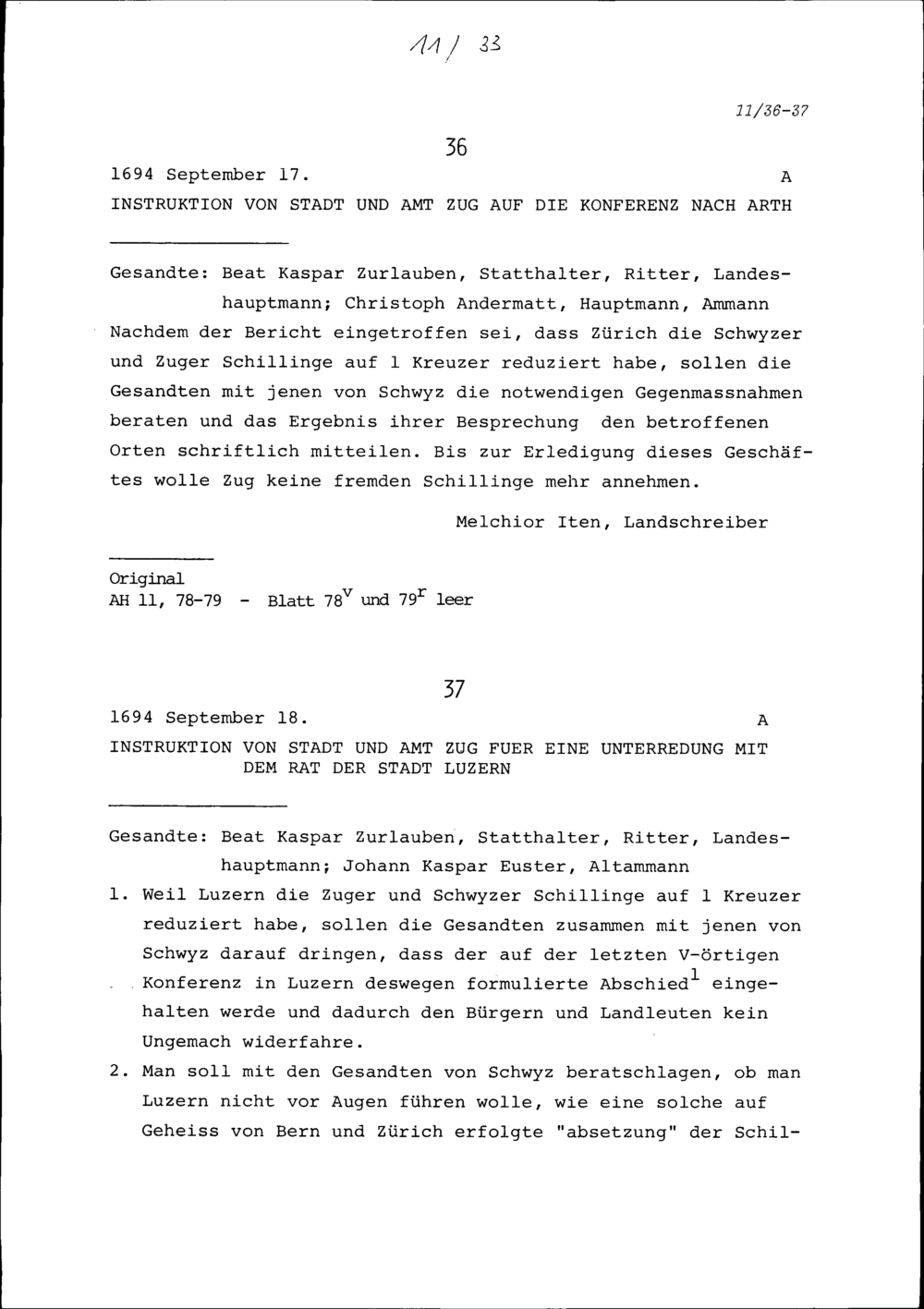 Instruktion von Stadt und Amt Zug auf die Konferenz in Arth