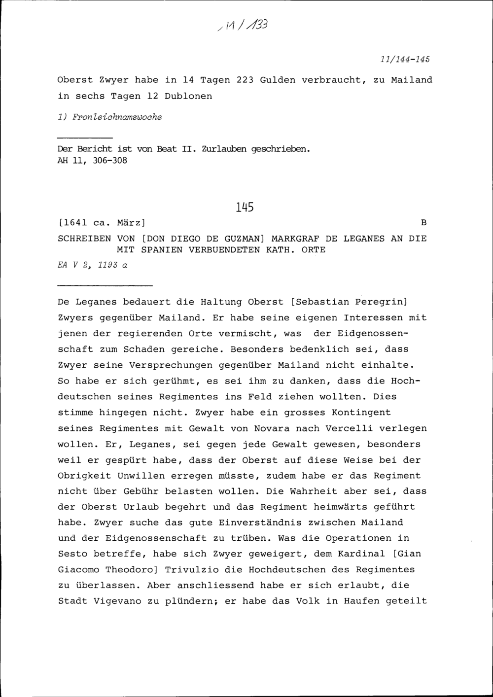 Schreiben von Don Diego de Guzman, Markgraf de Leganes, an die mit Spanien verbündeten Katholischen Orte