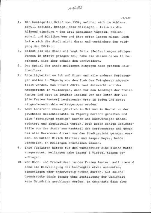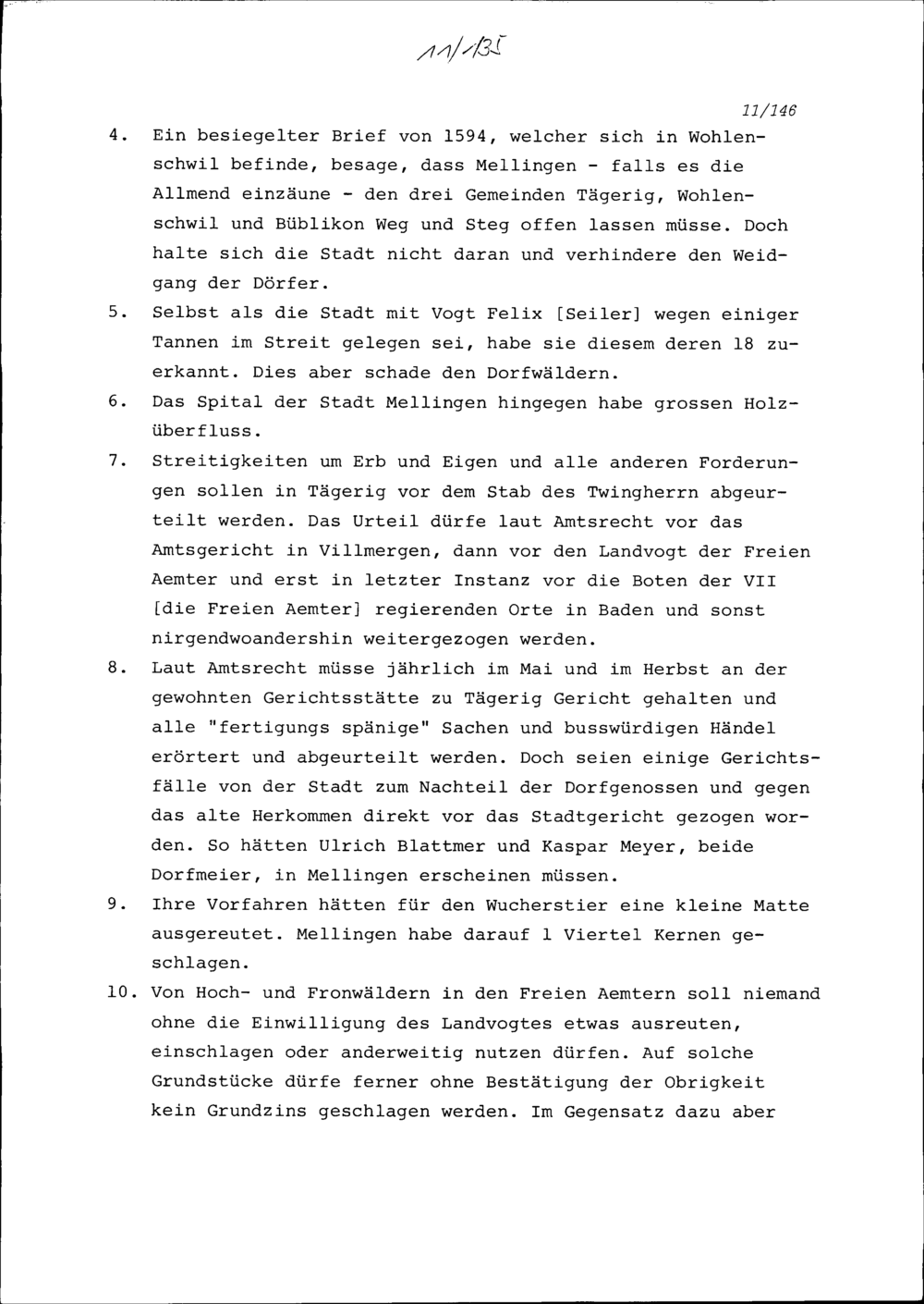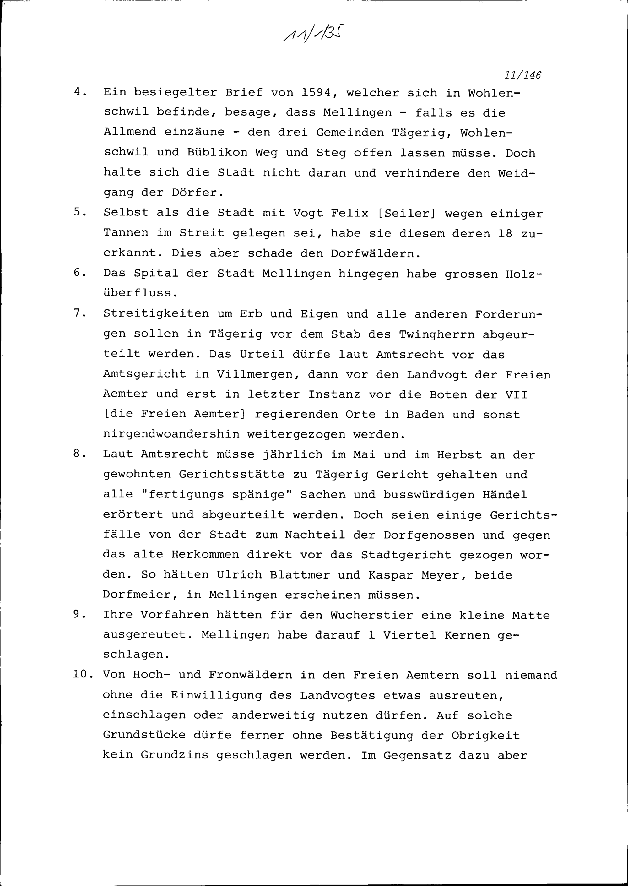 Verzeichnis der Klagen über die Eingriffe der Stadt Mellingen im Twing Tägerig
