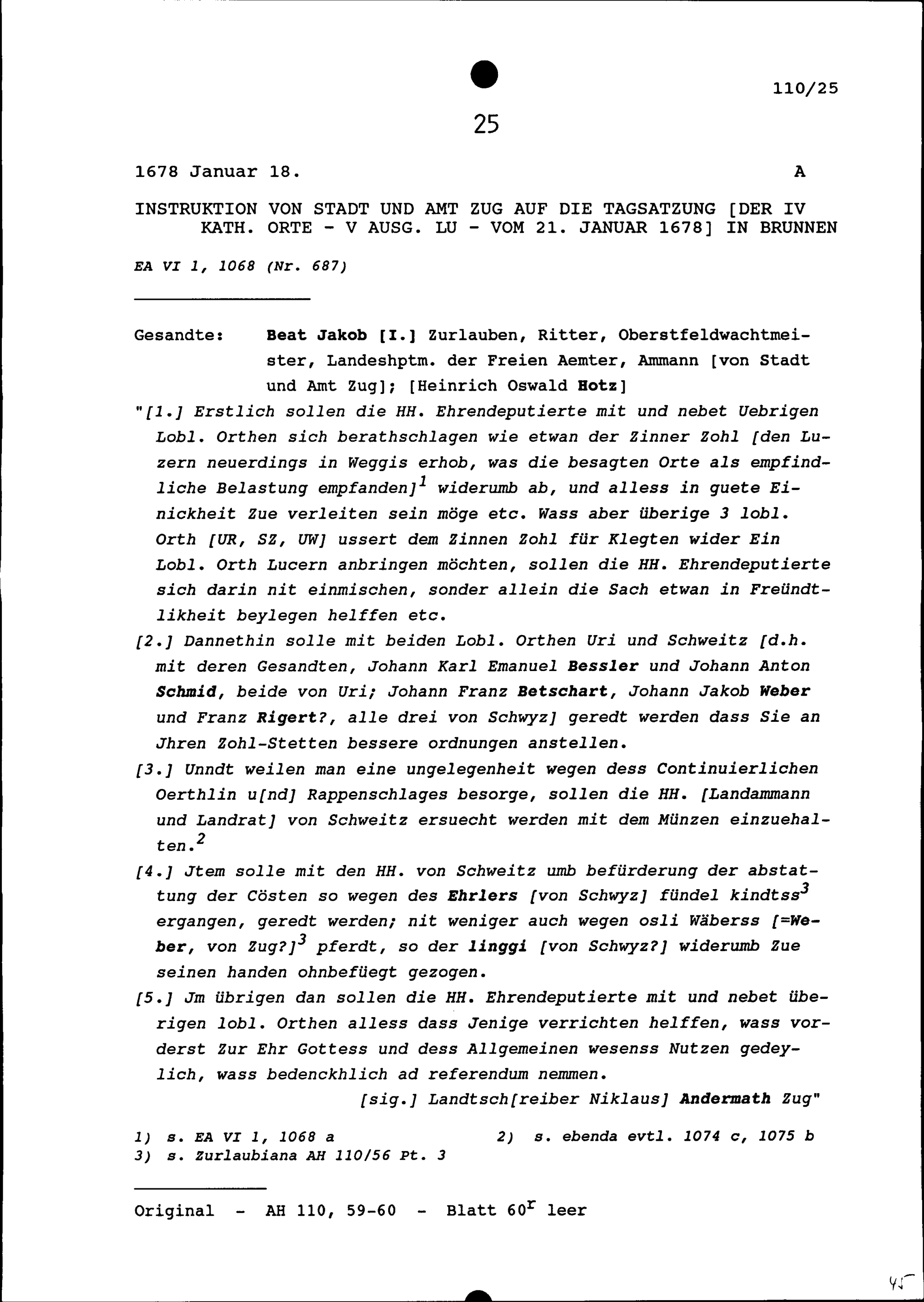 Instruktion von Stadt und Amt Zug auf die Tagsatzung der Vier Katholischen Orte vom 21. Januar 1678 in Brunnen