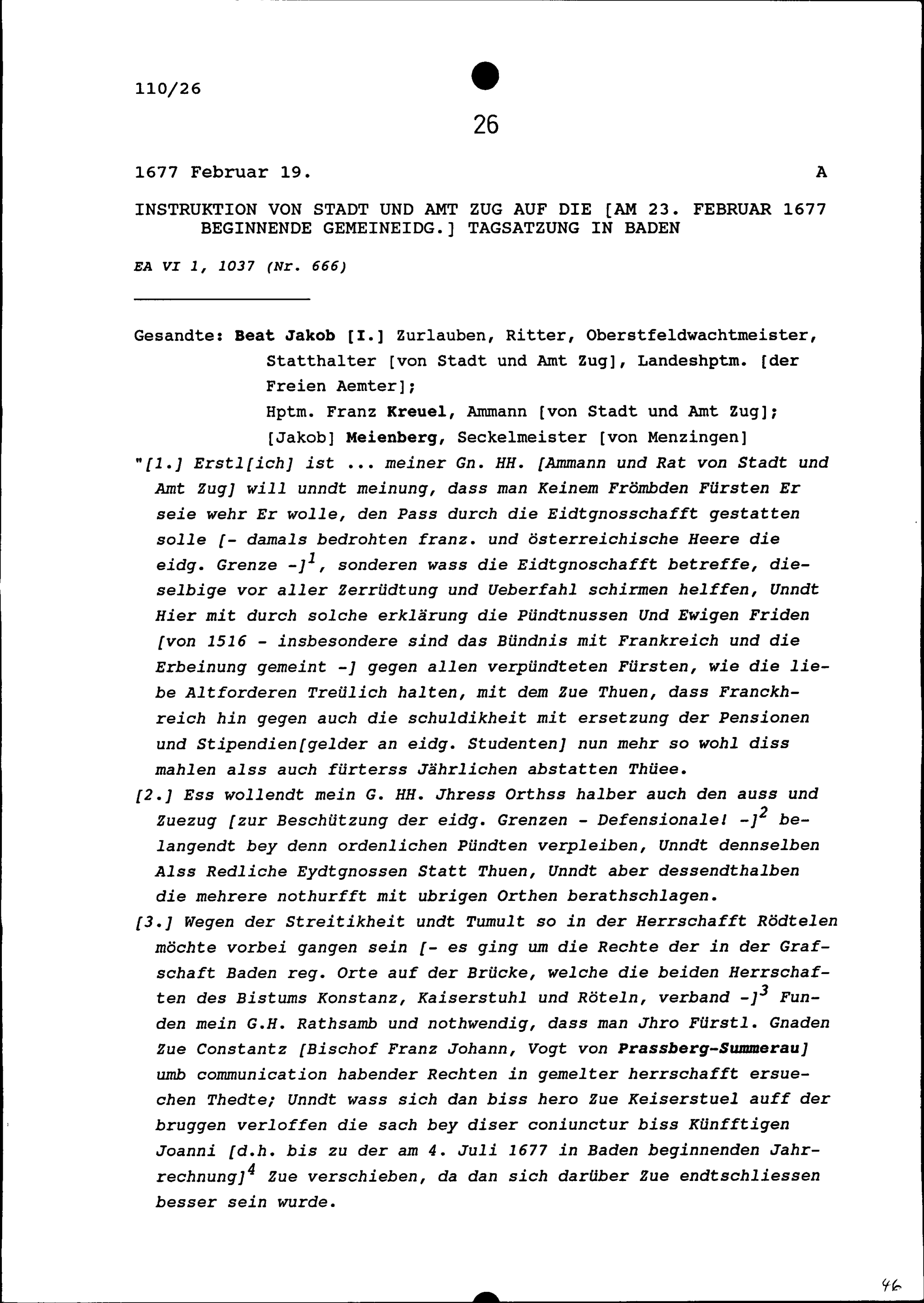 Instruktion von Stadt und Amt Zug auf die am 23. Februar 1677 beginnende Tagsatzung in Baden
