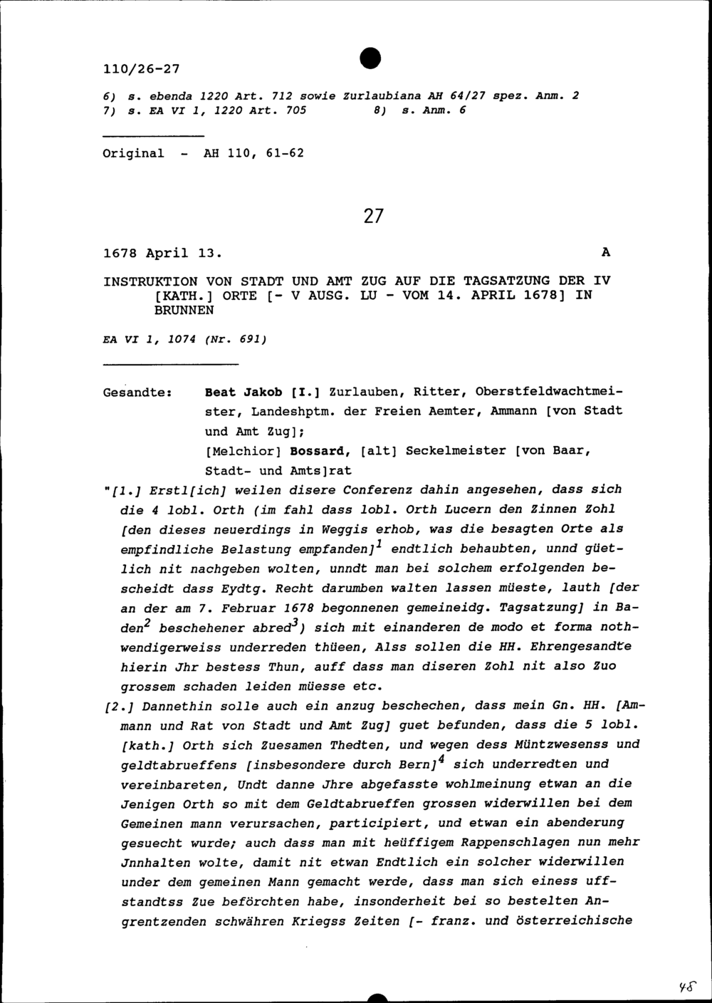 Instruktion von Stadt und Amt Zug auf die Tagsatzung der Vier Katholischen Orte vom 14. April 1678 in Brunnen