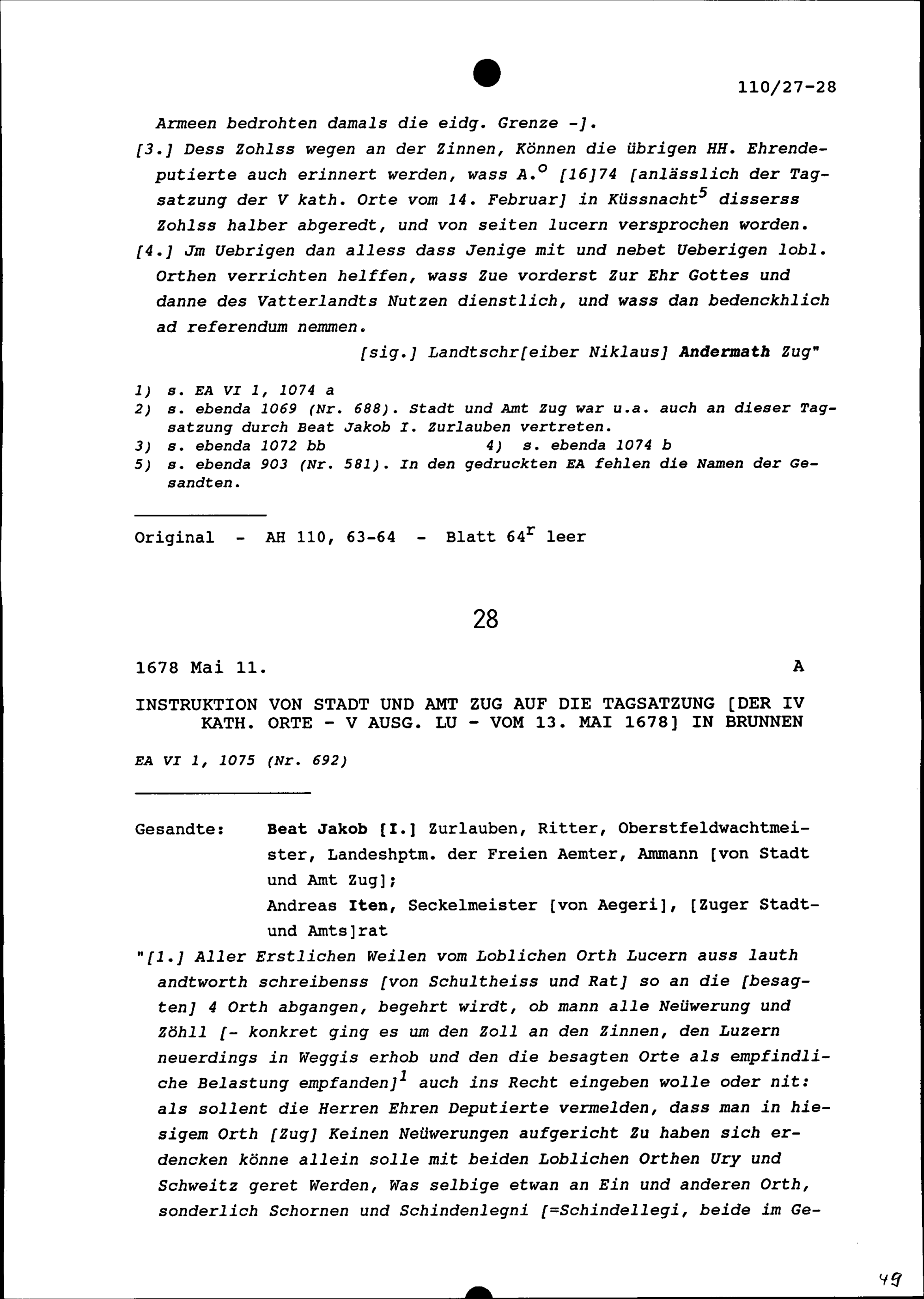 Instruktion von Stadt und Amt Zug auf die Tagsatzung der Vier Katholischen Orte vom 13. Mai 1678 in Brunnen