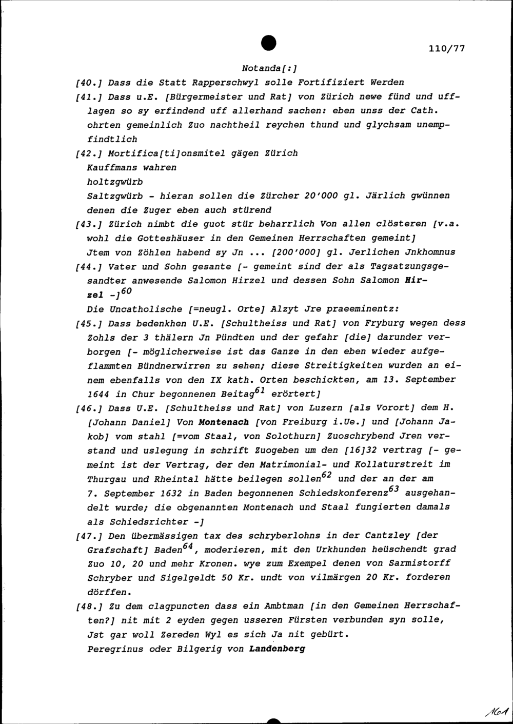 Notiz von Beat II. Zurlauben, Tagsatzungsgesandter von Stadt und Amt Zug, über die Tagsatzung der Dreizehn Orte vom 5. bis 25. Februar 1645 in Baden