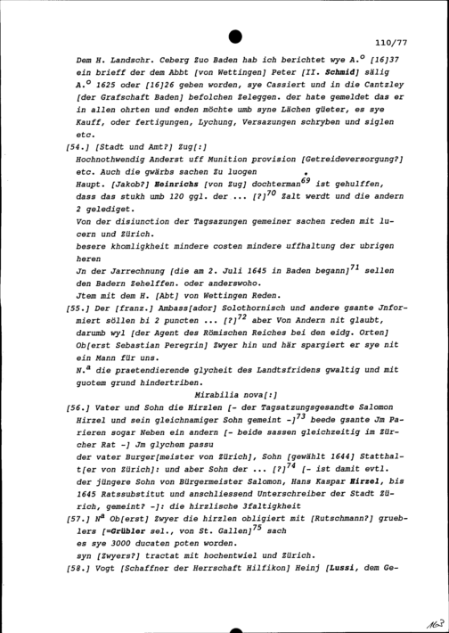 Notiz von Beat II. Zurlauben, Tagsatzungsgesandter von Stadt und Amt Zug, über die Tagsatzung der Dreizehn Orte vom 5. bis 25. Februar 1645 in Baden