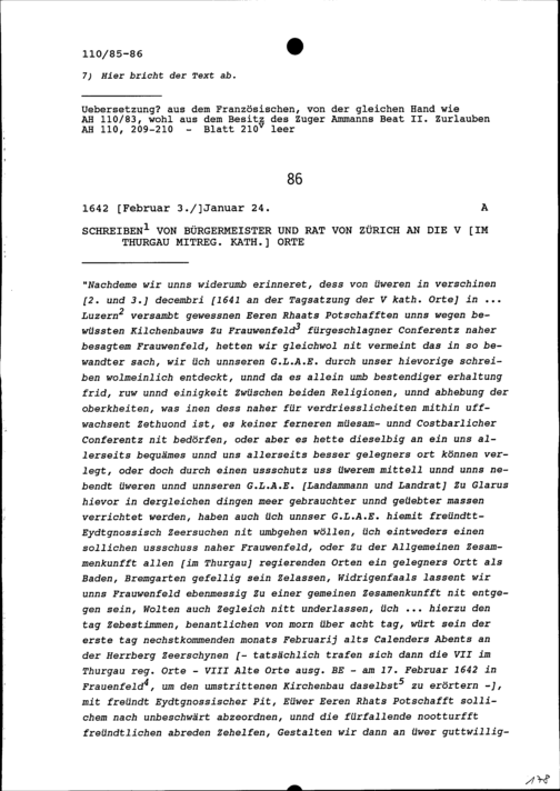 Schreiben des Bürgermeisters und Rats Zürich an die Fünf im Thurgau mitregierenden Katholischen Orte