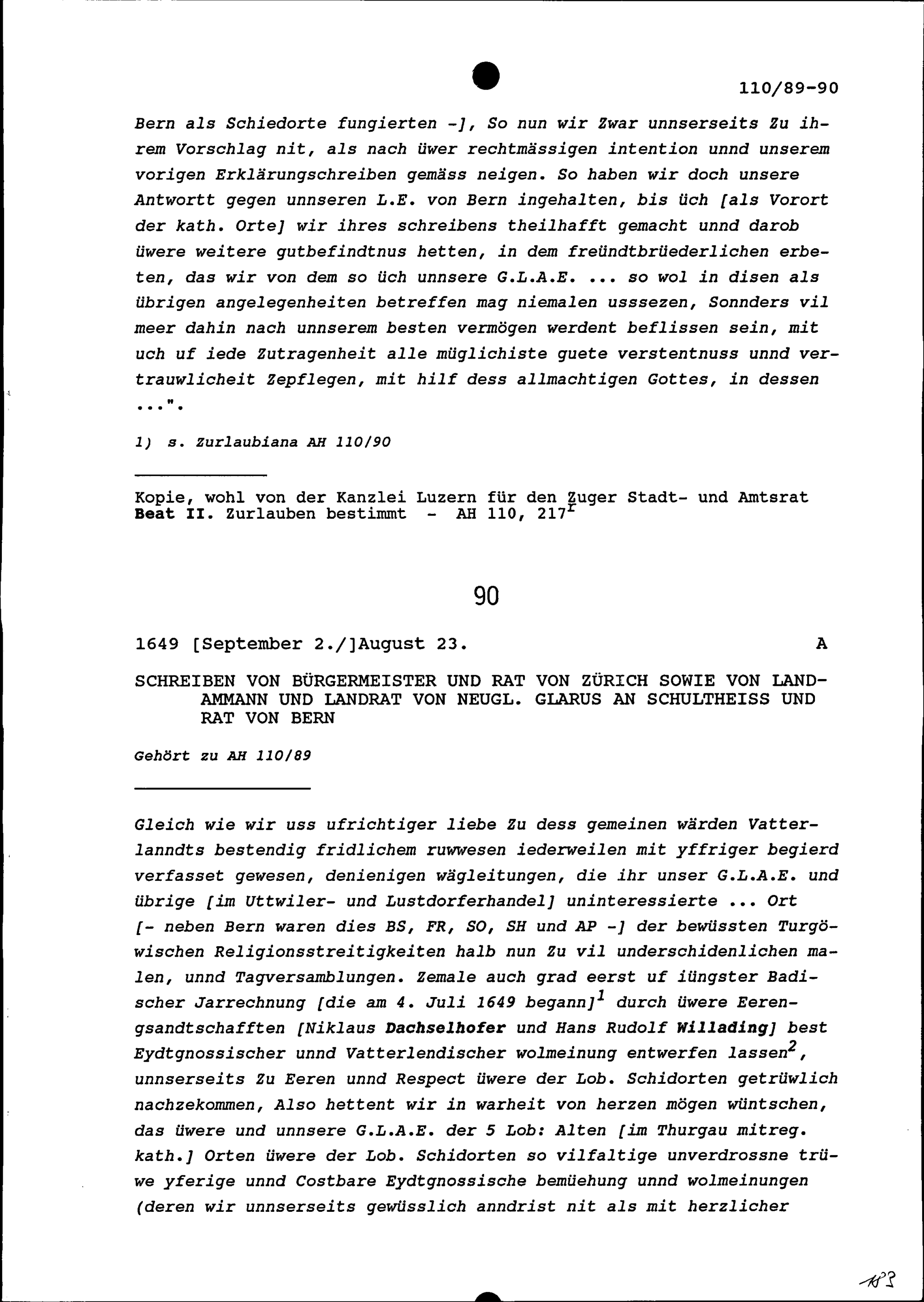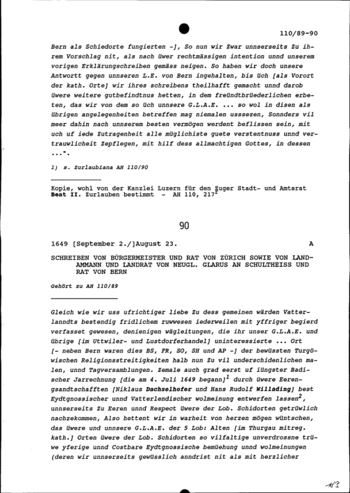 Schreiben des Bürgermeisters und Rats Zürich sowie des Landammanns und Landrats von Neugläubig Glarus an Schultheiss und Rat Bern