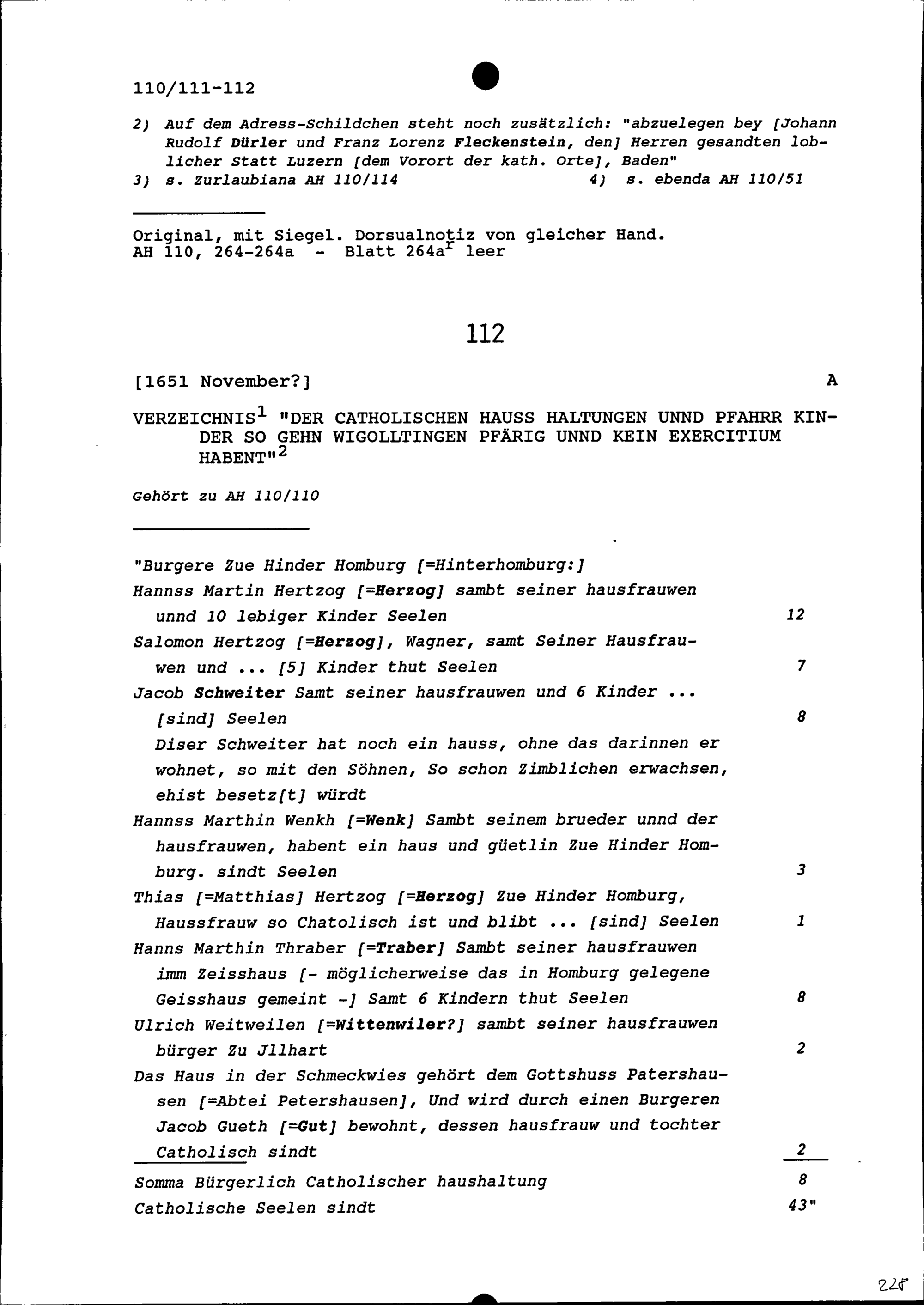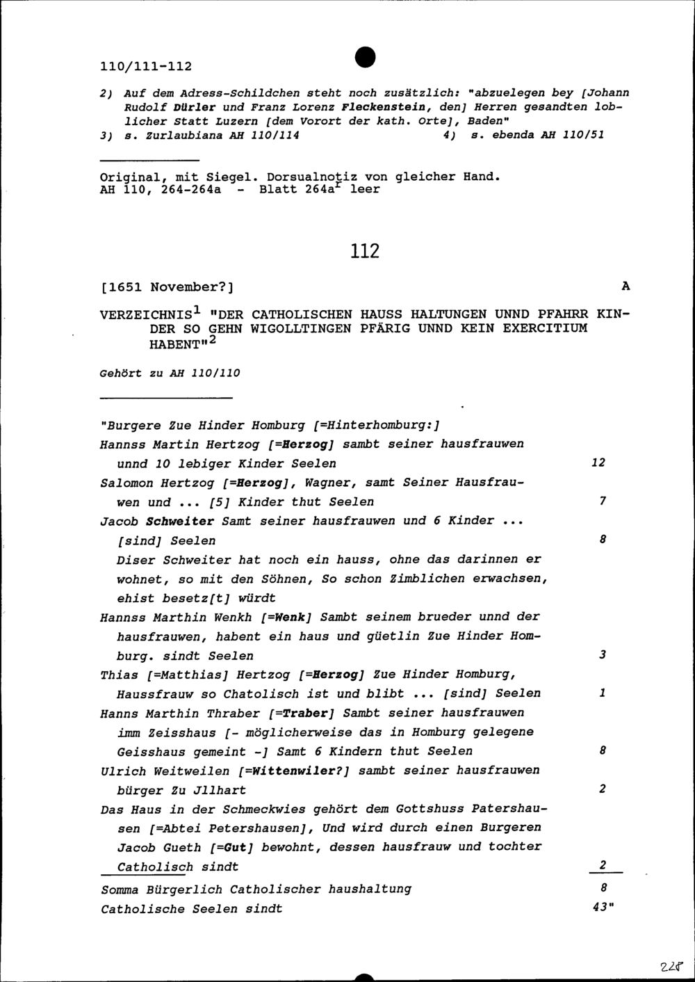 Verzeichnis der katholischen Haushaltungen, die nach Wigoltingen pfarrgenössig sind