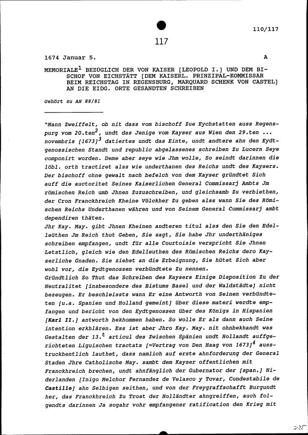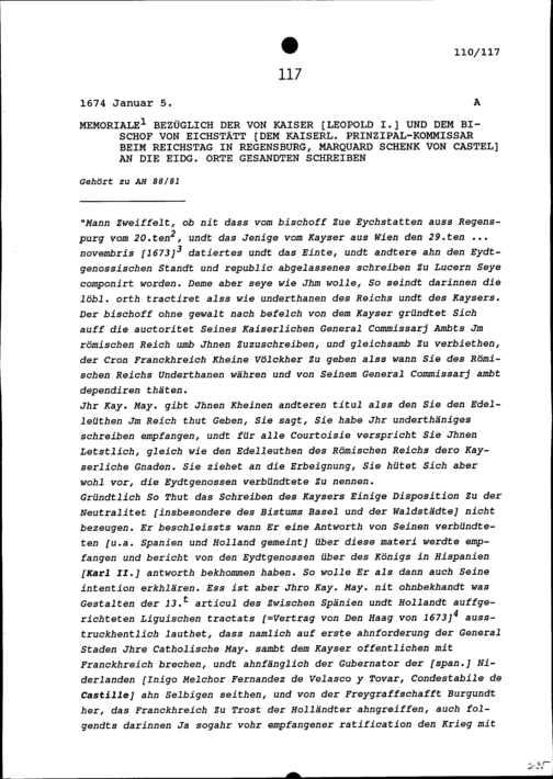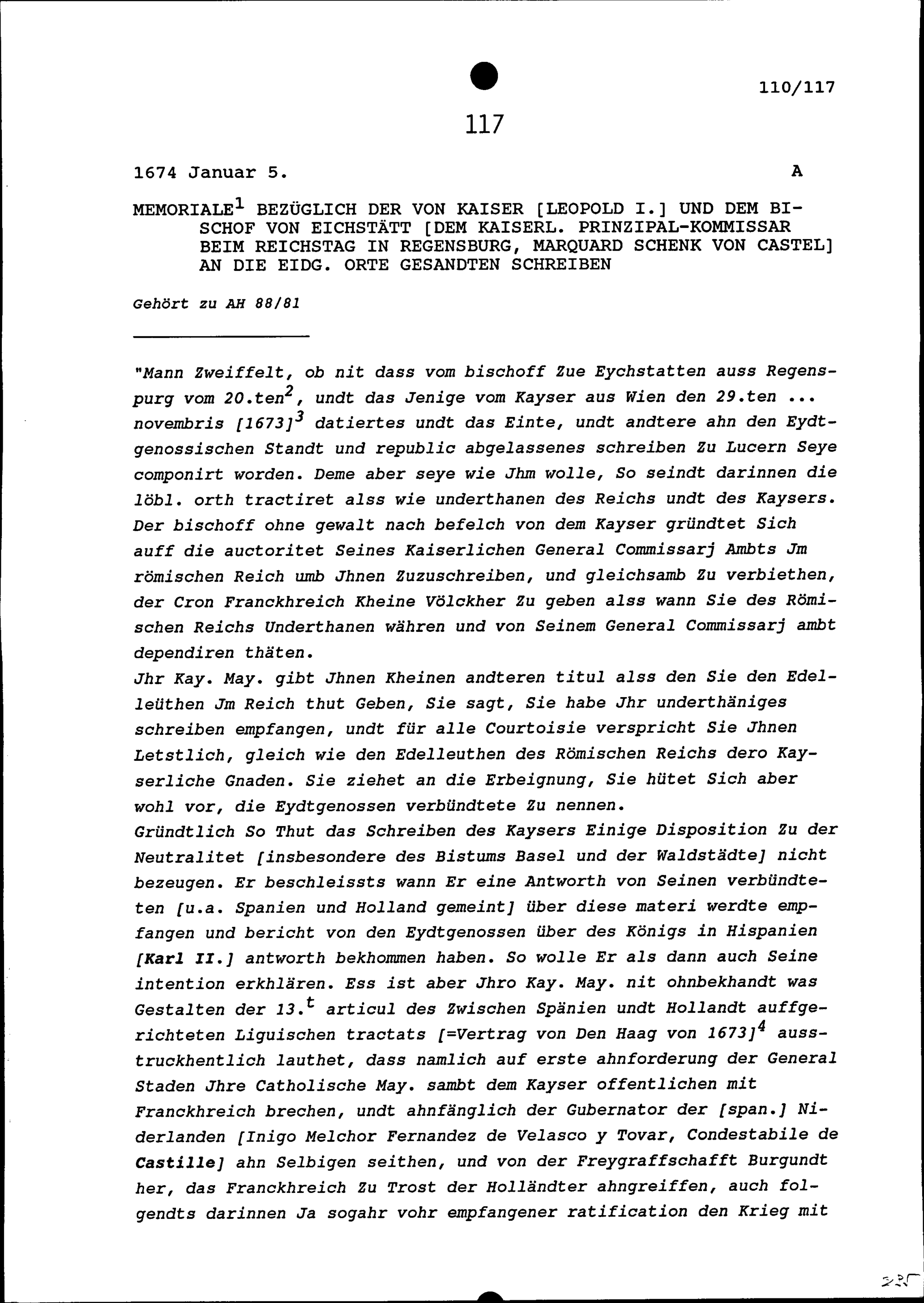 Bericht bezüglich der von Leopold I., Kaiser des Heiligen Römischen Reiches, und von Marquard Schenk von Castel, Bischof von Eichstätt und kaiserlicher Prinzipalkommissar beim Reichstag in Regensburg, an die Eidgenössischen Orte Gesandten Schreiben