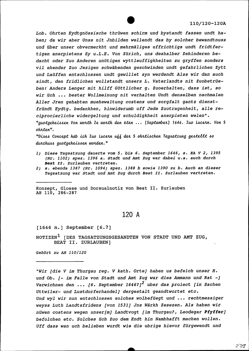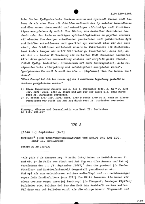 Notiz von Beat II. Zurlauben, Tagsatzungsgesandter
