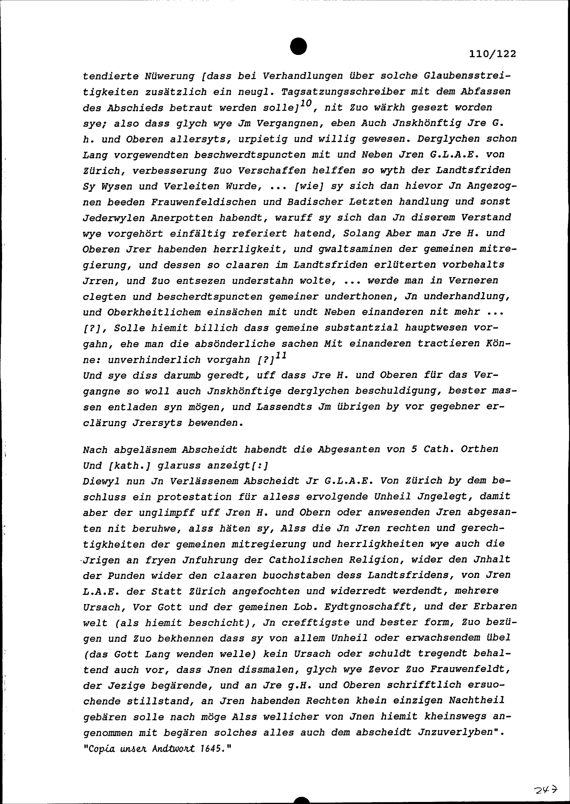 Stellungnahmen der Fünf im Thurgau mitregierenden Katholischen Orte sowie von Katholisch Glarus (Uttwiler- und Lustdorferhandel), an der Jahrrechnung in Baden vom 2. bis 21. Juli 1645, aufgezeichnet von Beat II. Zurlauben, Tagsatzungsgesandter von Stadt und Amt Zug