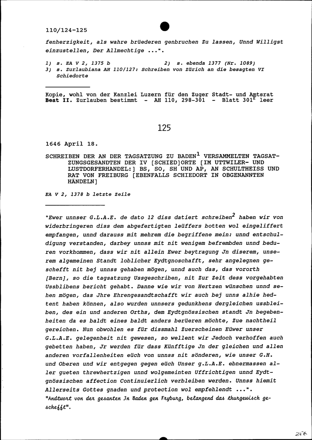 Schreiben der Vier Schiedsorte Basel, Solothurn, Schaffhausen und Appenzell, an Schultheiss und Rat von Freiburg