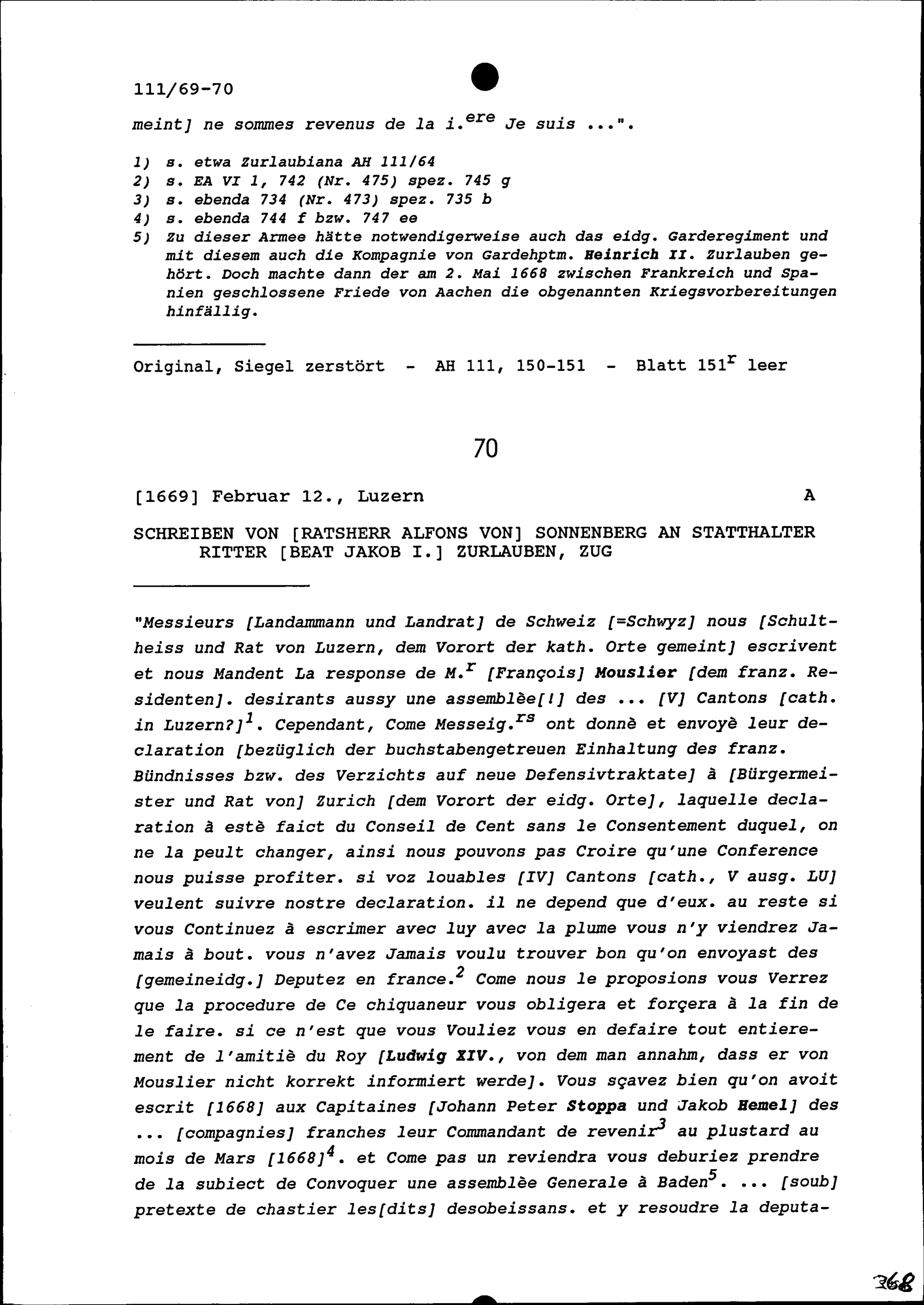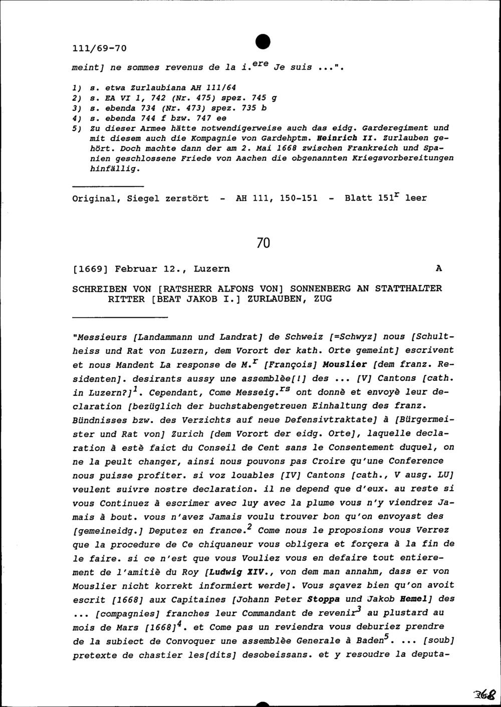 Schreiben von Alfons von Sonnenberg, Ratsherr, an Beat Jakob I. Zurlauben, Statthalter, Zug