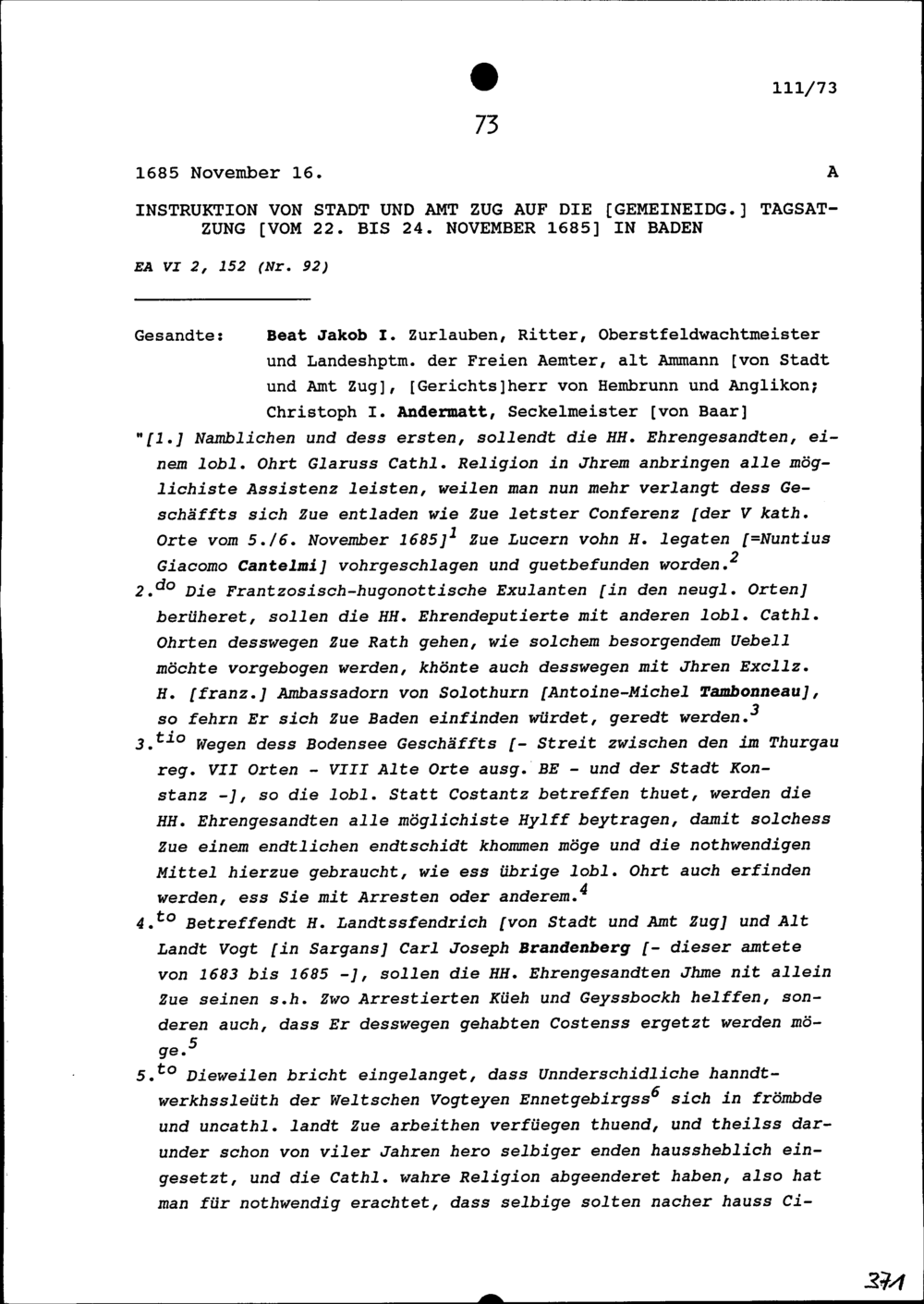 Instruktion von Stadt und Amt Zug auf die Tagsatzung vom 22. bis 24. November 1685 in Baden