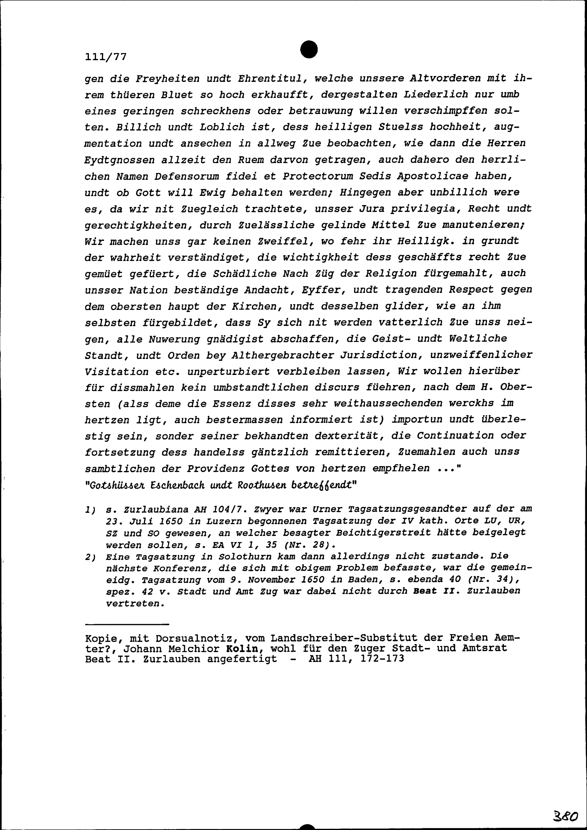 Schreiben des Schultheiss und Rats Solothurn an Sebastian Peregrin Zwyer, Landammann von Uri und Oberst