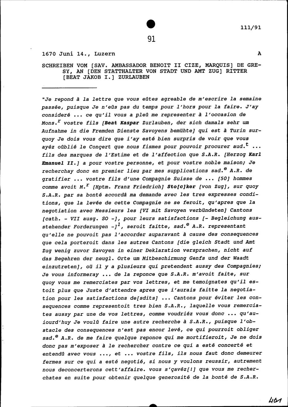 Schreiben von Benoît II. Cize, Marquis de Grésy, Ambassador von Savoyen, an Beat Jakob I. Zurlauben, Statthalter von Stadt und Amt Zug
