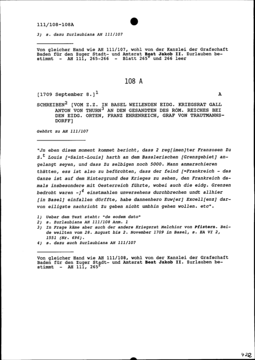 Schreiben von Gall Anton von Thurn, Eidgenössischer Kriegsrat, an Franz Ehrenreich, Graf von Trautmannsdorff, Gesandter des Römischen Reiches bei den Eidgenössischen Orten