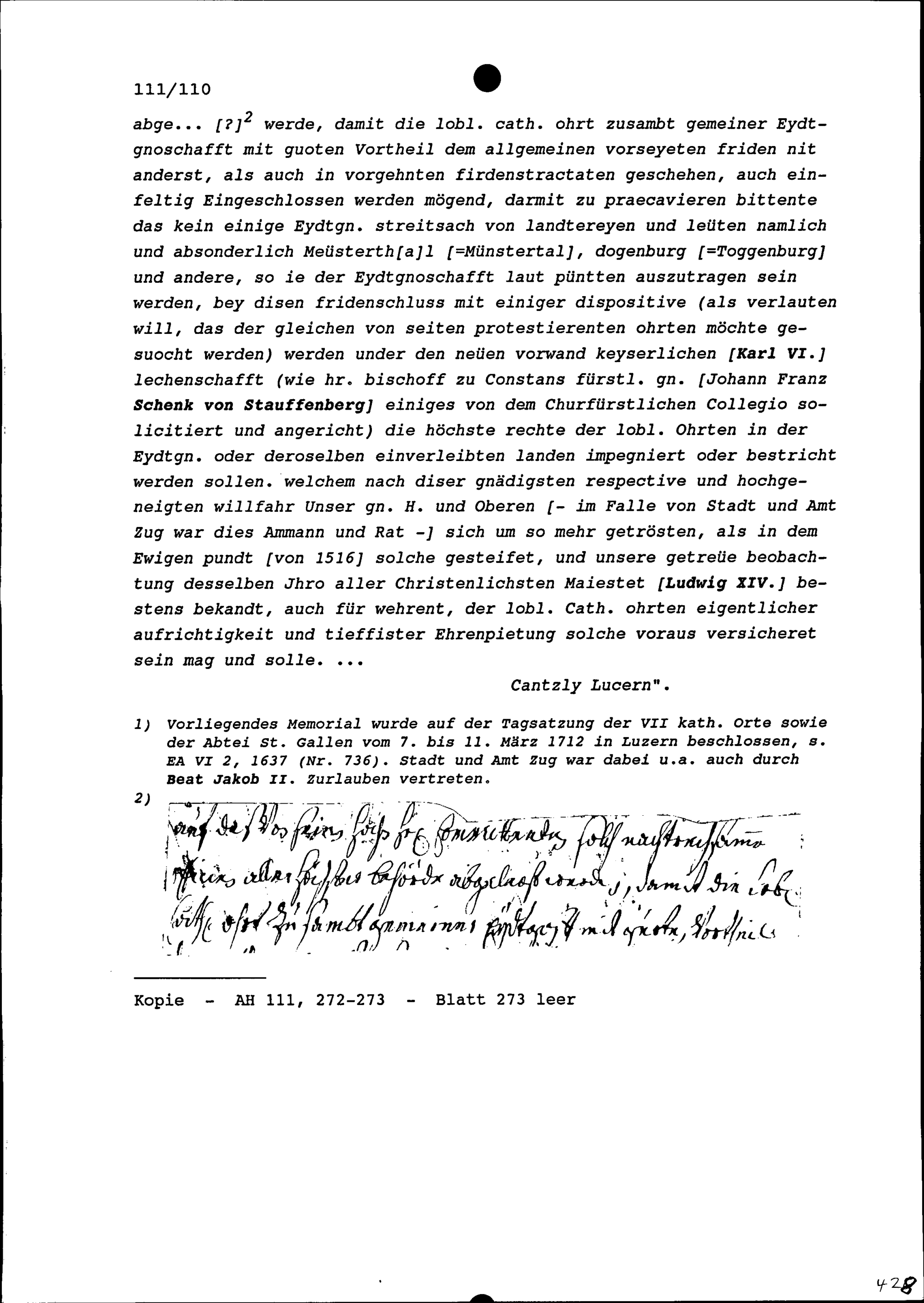 Bericht der Katholischen Orte bezüglich der Wahrung ihrer Interessen bei den Friedensverhandlungen...