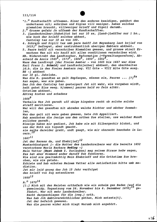 Klagen und Vorwürfen von Heinrich Ludwig Zurlauben in Zusammenhang mit seiner 1670 erfolgten Absetzung als Landschreiber der Freien Ämter 1665