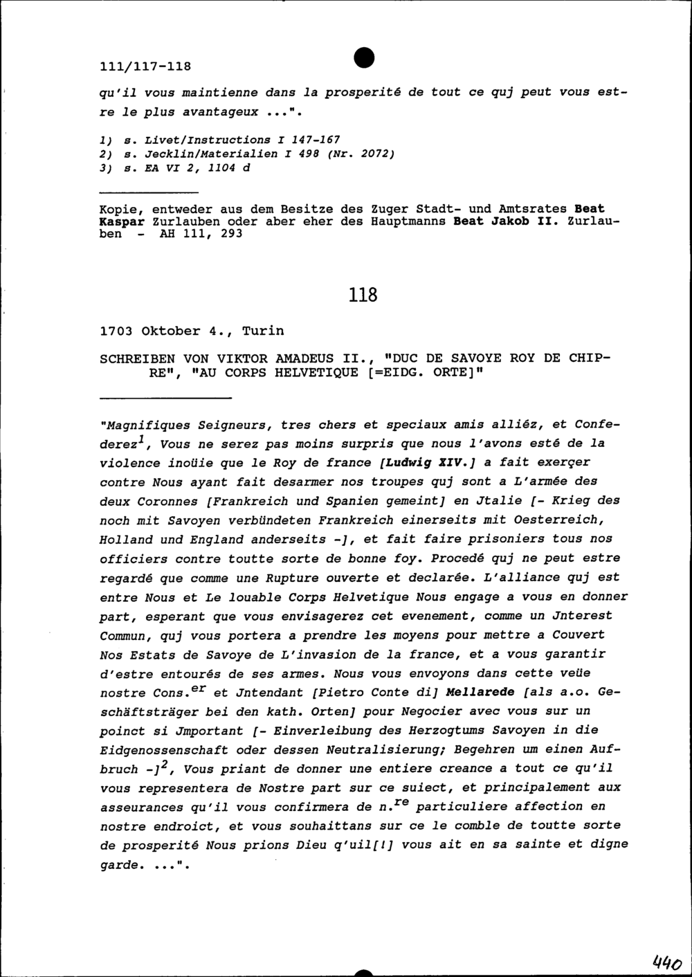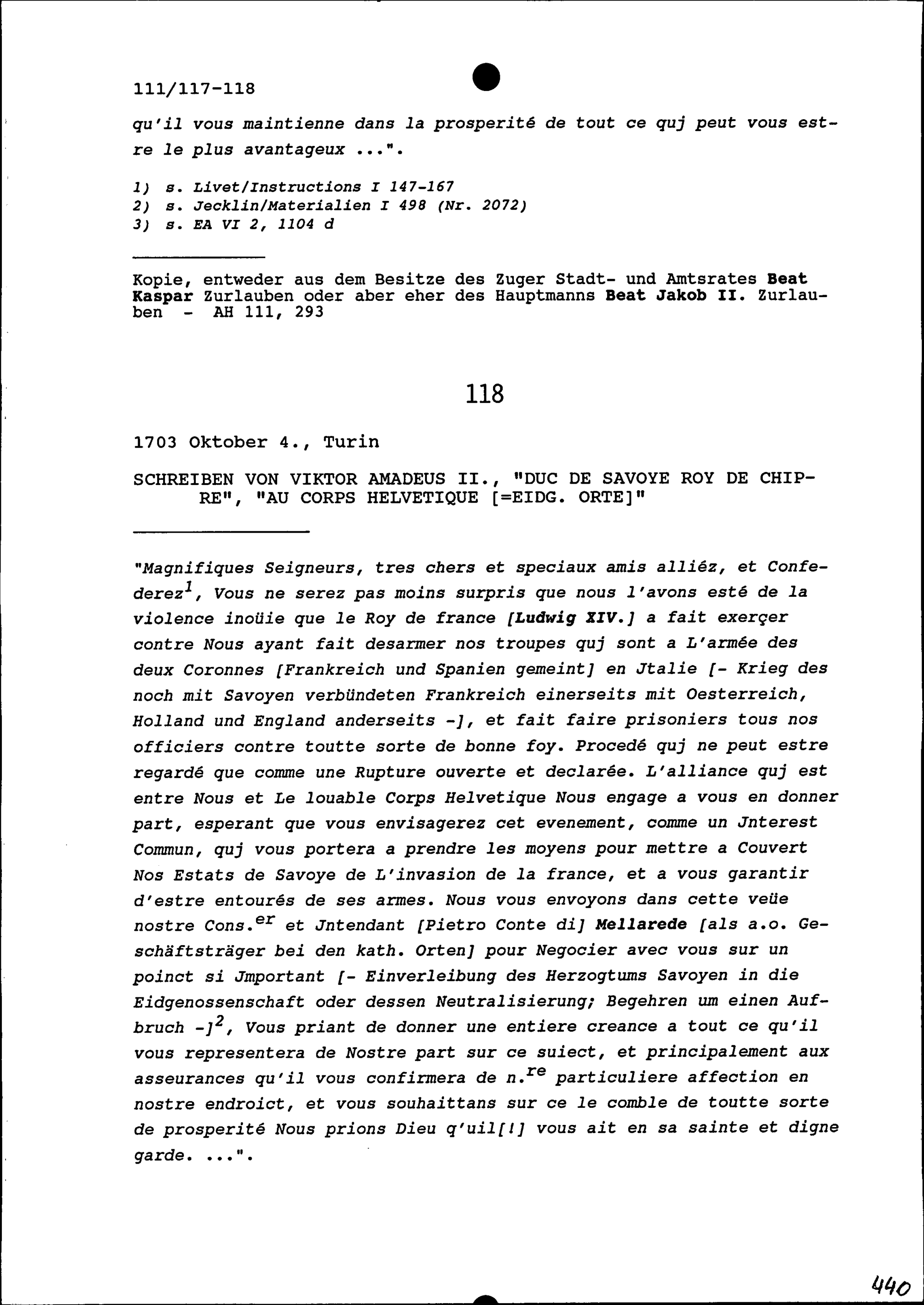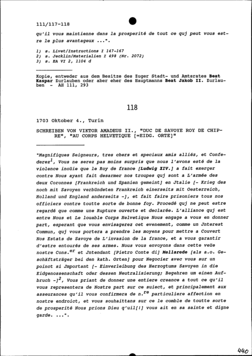 Schreiben von Viktor Amadeus II., Herzog von Savoyen, an die Eidgenössischen Orte