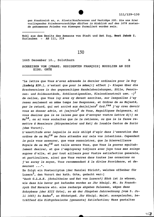 Schreiben von François Mouslier, Resident von Frankreich, an die Eidgenössischen Orte