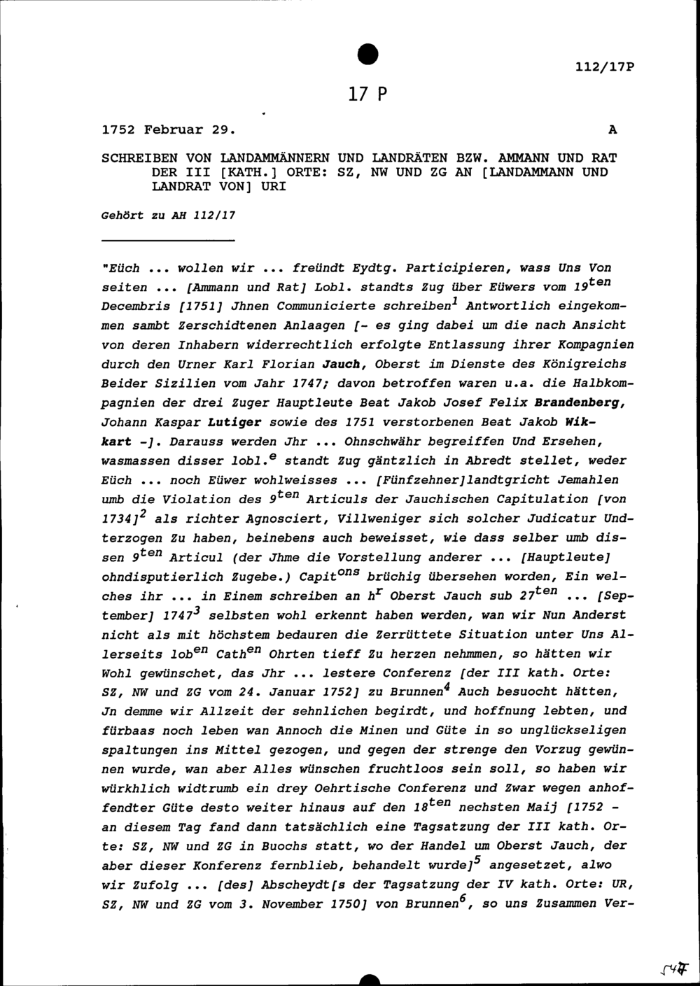 Schreiben der Landammänner und Landräte Drei Katholischen Orte Schwyz, Nidwalden und Zug an Landammann und Landrat Uri
