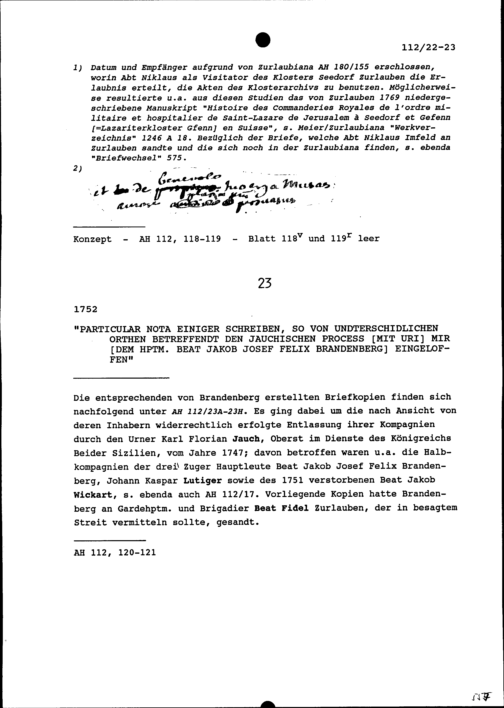Kopien einiger Schreiben in Sachen Prozess mit Karl Florian Jauch, Oberst, zusammengestellt von Beat Jakob Josef Felix Brandenberg, Hauptmann