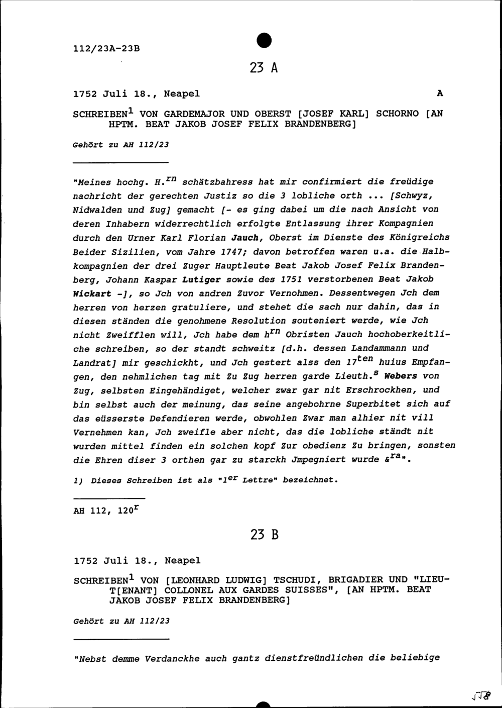 Schreiben von Josef Karl Schorno, Gardemajor und Oberst, an Beat Jakob Josef Felix Brandenberg, Hauptmann