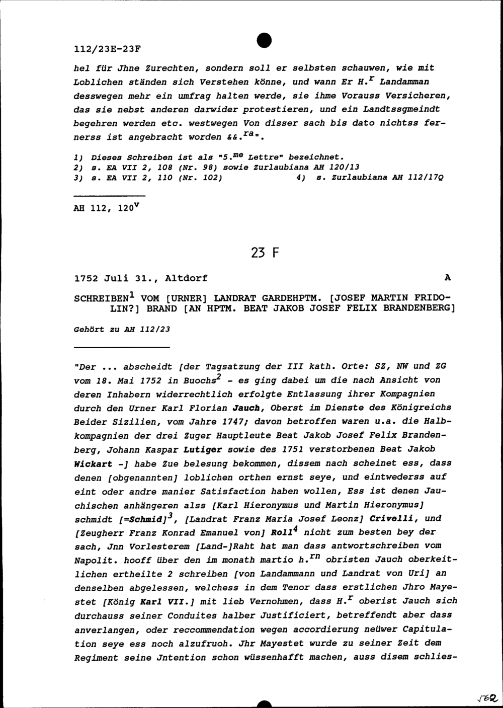 Schreiben von Josef Martin Fridolin Brand, Landrat Uri und Gardehauptmann, an Beat...