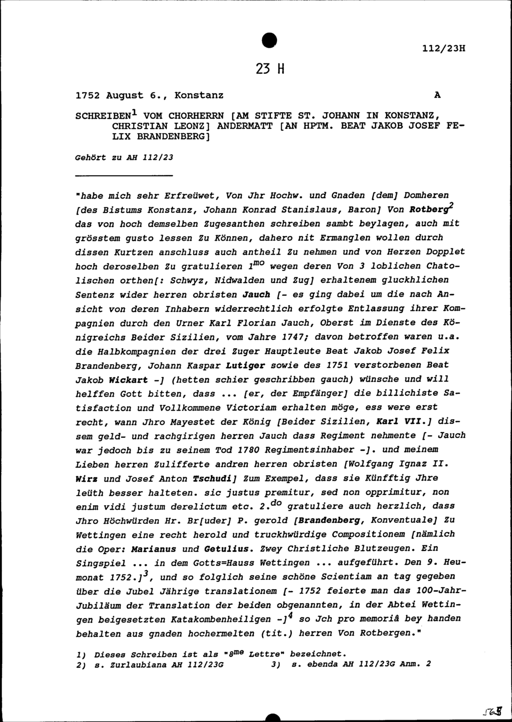 Schreiben von Christian Leonz Andermatt, Chorherr am Stifte Sankt Johann in Konstanz, an Beat Jakob Josef Felix Brandenberg, Hauptmann