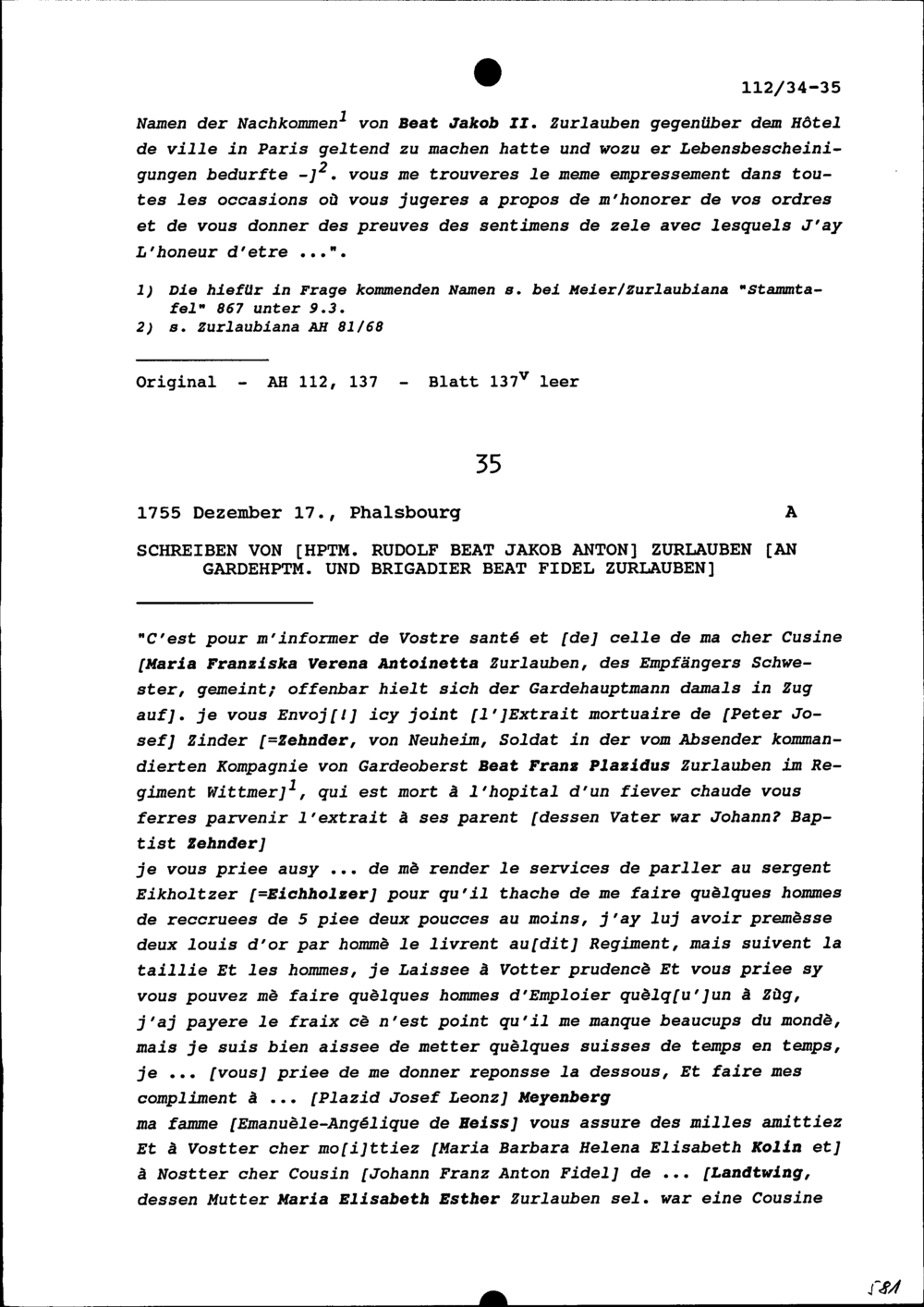 Schreiben von Rudolf Beat Jakob Anton Zurlauben, Hauptmann, an Beat Fidel Zurlauben, Gardehauptmann und Brigadier