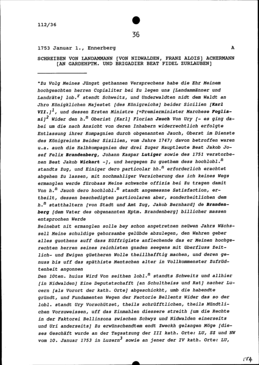 Schreiben von Franz Alois Achermann, Landammann von Nidwalden, an Beat Fidel Zurlauben, Gardehauptmann und Brigadier