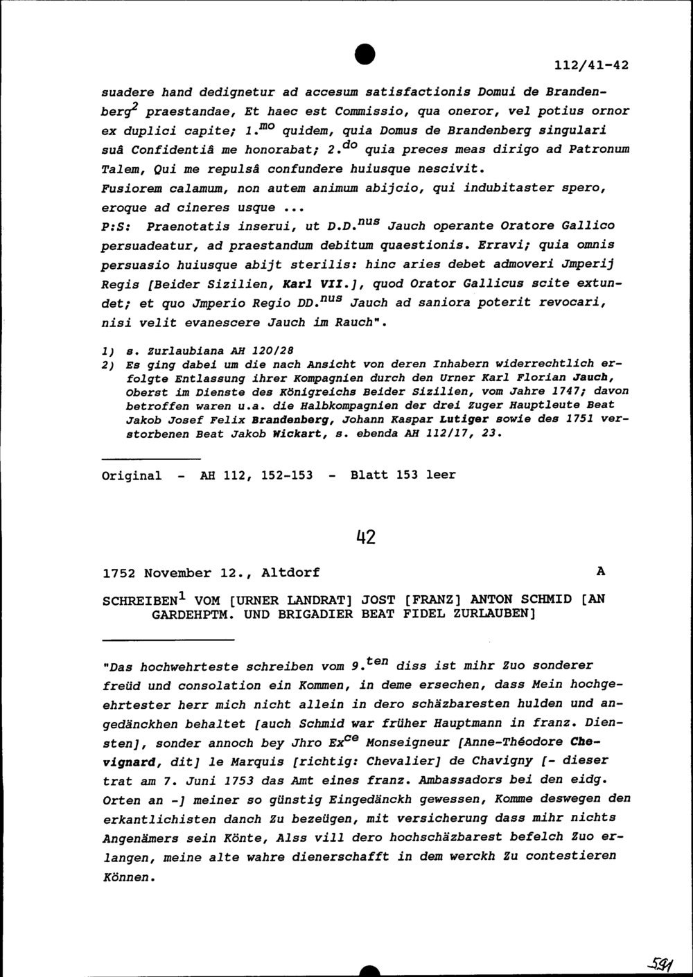 Schreiben von Jost Franz Anton Schmid, Landrat Uri, an Beat Fidel Zurlauben, Gardehauptmann und Brigadier
