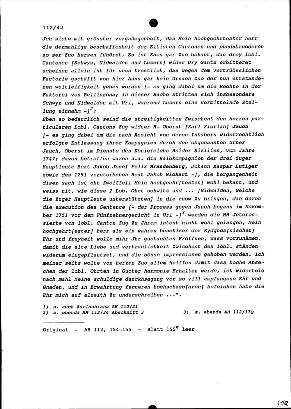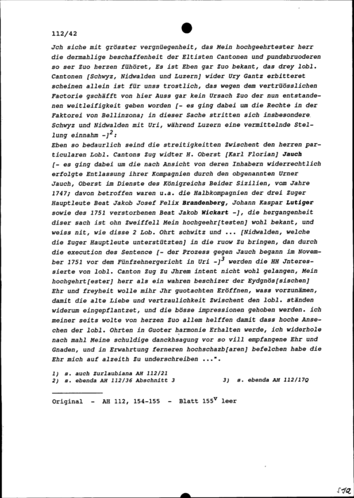 Schreiben von Jost Franz Anton Schmid, Landrat Uri, an Beat Fidel Zurlauben, Gardehauptmann und Brigadier